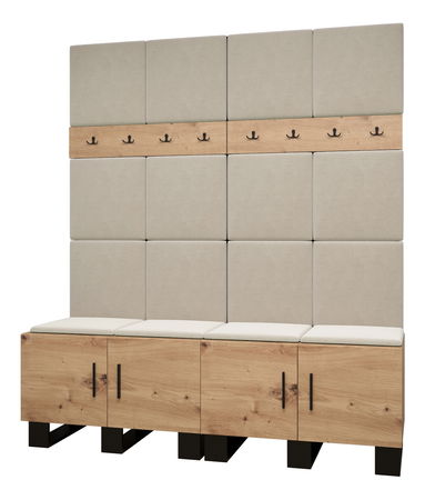 Designová předsíňová sestava Amanda se stane krásným a zejména praktickým doplňkem Vašeho interiéru. Praktická dvojkombinace skříněk na boty nabídne dostatečně velký úložný prostor pro Vaše boty a dva věšákové panely poskytnou dostatek místa pro zavěšení Vašich větrovek či kabátů. Moderní akcent síně je zvýrazněn i čalouněnými panely, které předsíni dodávají nejen přitažlivý styl a eleganci, ale také poskytují i ochranu Vašeho nábytku před poškozením a výborné akustické vlastnosti.