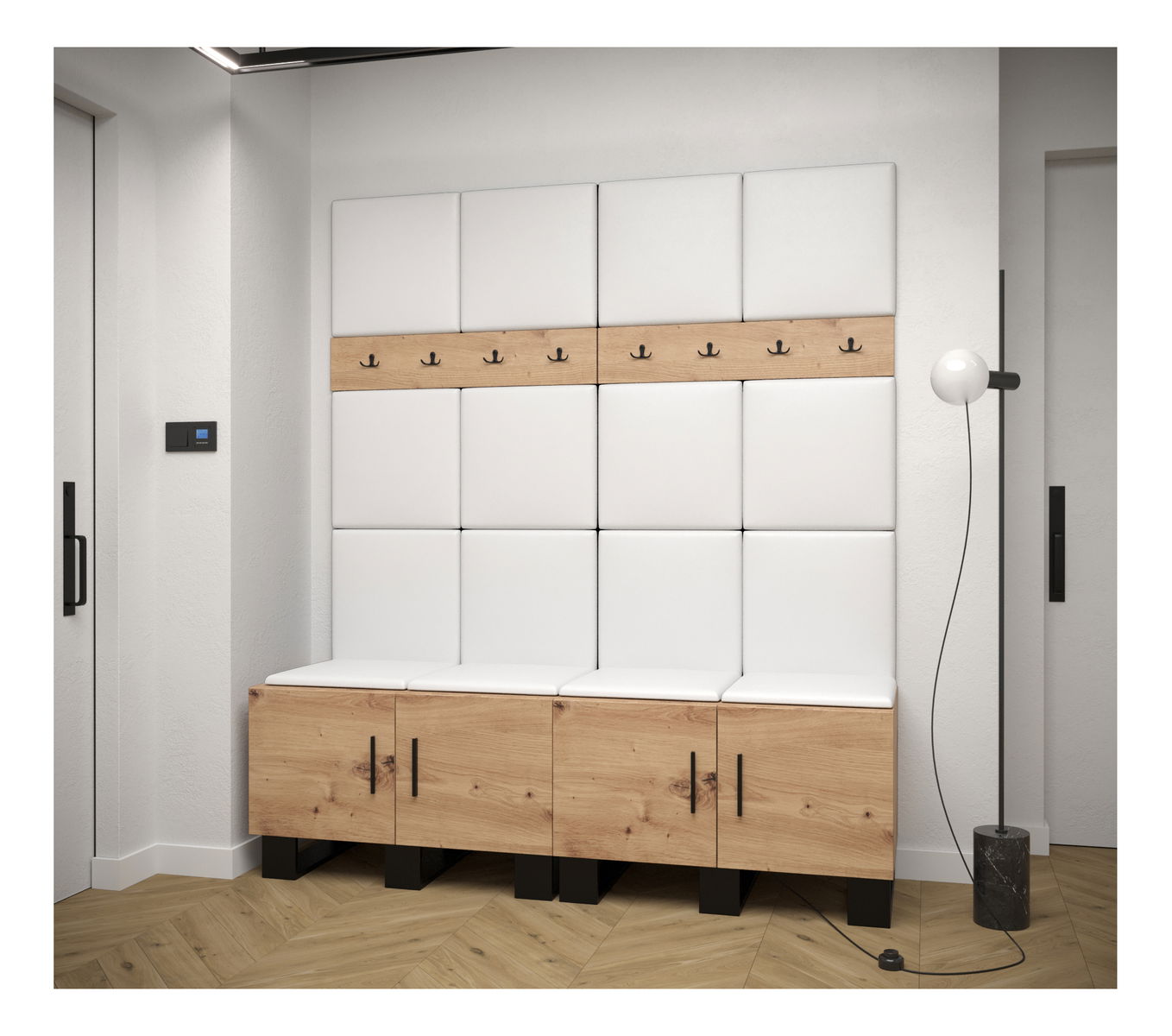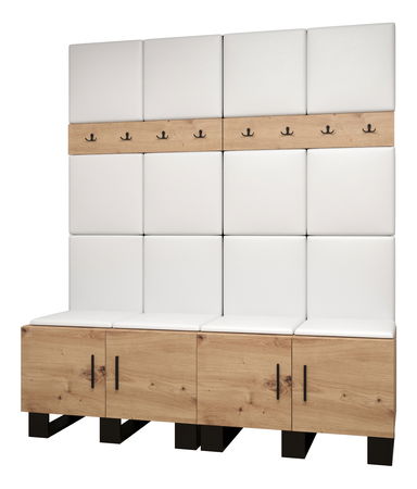 Designová předsíňová sestava Amanda se stane krásným a zejména praktickým doplňkem Vašeho interiéru. Praktická dvojkombinace skříněk na boty nabídne dostatečně velký úložný prostor pro Vaše boty a dva věšákové panely poskytnou dostatek místa pro zavěšení Vašich větrovek či kabátů. Moderní akcent síně je zvýrazněn i čalouněnými panely, které předsíni dodávají nejen přitažlivý styl a eleganci, ale také poskytují i ochranu Vašeho nábytku před poškozením a výborné akustické vlastnosti.