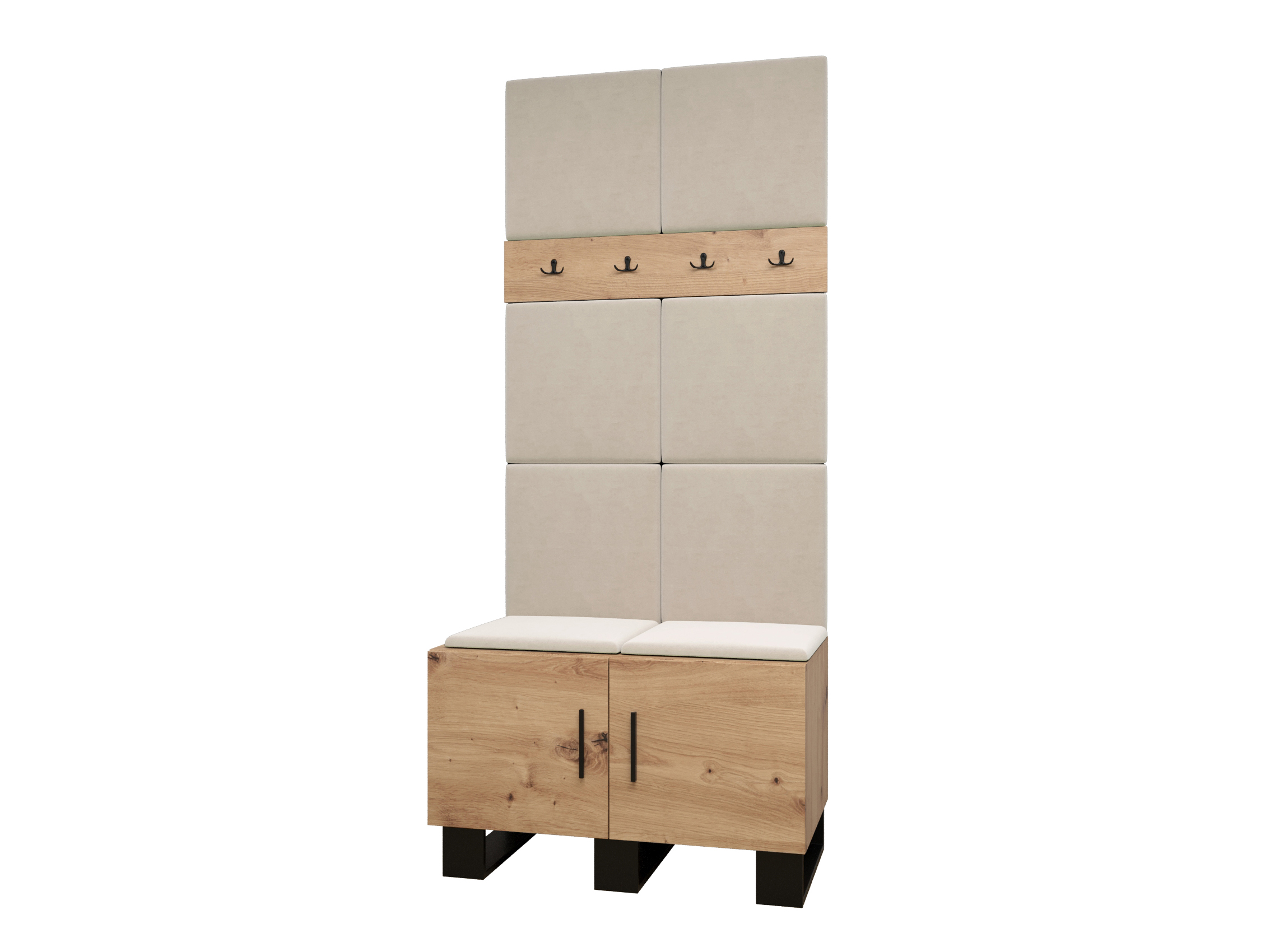 Designová předsíňová sestava Amanda se stane krásným a zejména praktickým doplňkem Vašeho interiéru. Praktická kombinace skříňky na boty s věšákovým panelem nabídne úložný prostor pro Vaše boty a místo pro zavěšení Vašich větrovek či kabátů. Moderní akcent síně je zvýrazněn i čalouněnými panely, které předsíni dodávají nejen přitažlivý styl a eleganci, ale také poskytují i ochranu Vašeho nábytku před poškozením a výborné akustické vlastnosti.