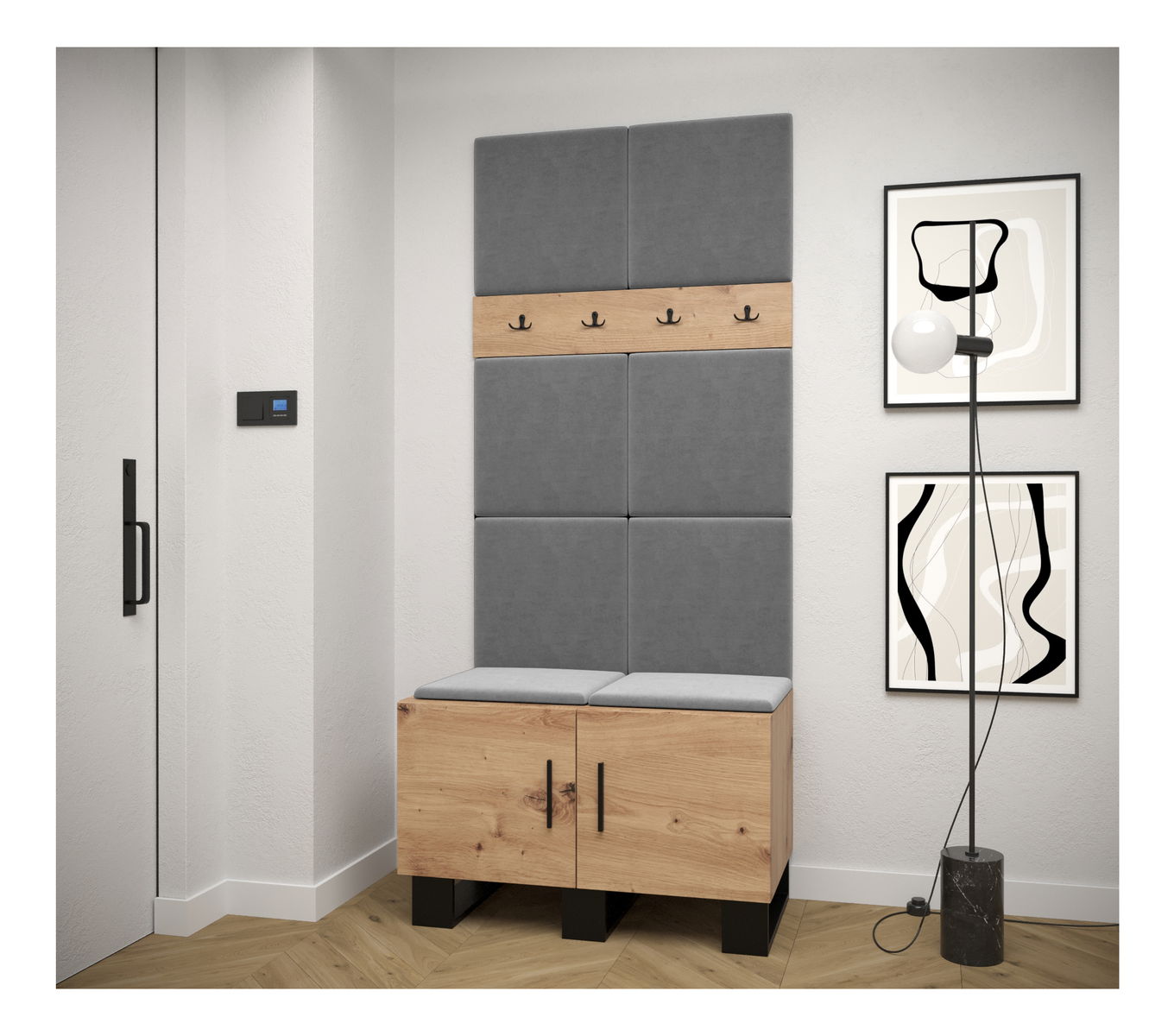 Designová předsíňová sestava Amanda se stane krásným a zejména praktickým doplňkem Vašeho interiéru. Praktická kombinace skříňky na boty s věšákovým panelem nabídne úložný prostor pro Vaše boty a místo pro zavěšení Vašich větrovek či kabátů. Moderní akcent síně je zvýrazněn i čalouněnými panely, které předsíni dodávají nejen přitažlivý styl a eleganci, ale také poskytují i ochranu Vašeho nábytku před poškozením a výborné akustické vlastnosti.