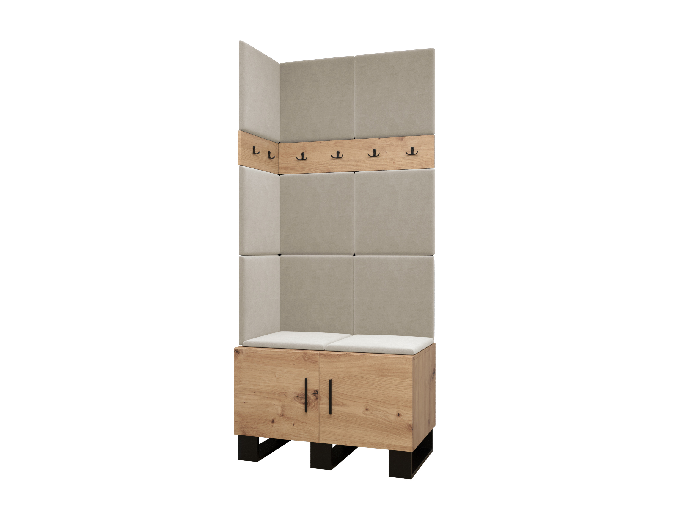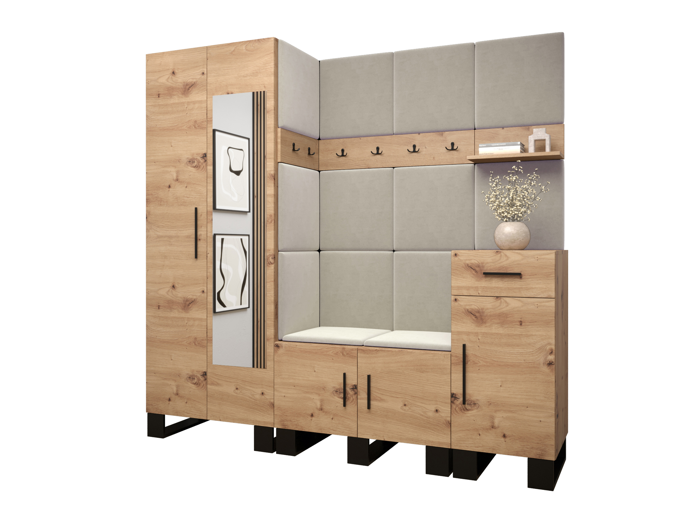 Designová předsíňová sestava Amanda se stane krásným a zejména praktickým doplňkem Vašeho interiéru. Praktický věšákový panel se s lehkostí postará o uložení či zavěšení Vašich větrovek a kabátů, do malé skříňky se vejdou Vaše boty a v komodě budete mít po ruce Vaše osobní věci a drobnosti. Sestava také obsahuje i praktickou nástěnnou polici která nabídne místo např. pro Vaše dekorace. Moderní akcent síně je zvýrazněn i čalouněnými panely, které předsíni dodávají nejen přitažlivý styl a eleganci, ale také poskytují i ochranu Vašeho nábytku před poškozením a výborné akustické vlastnosti.