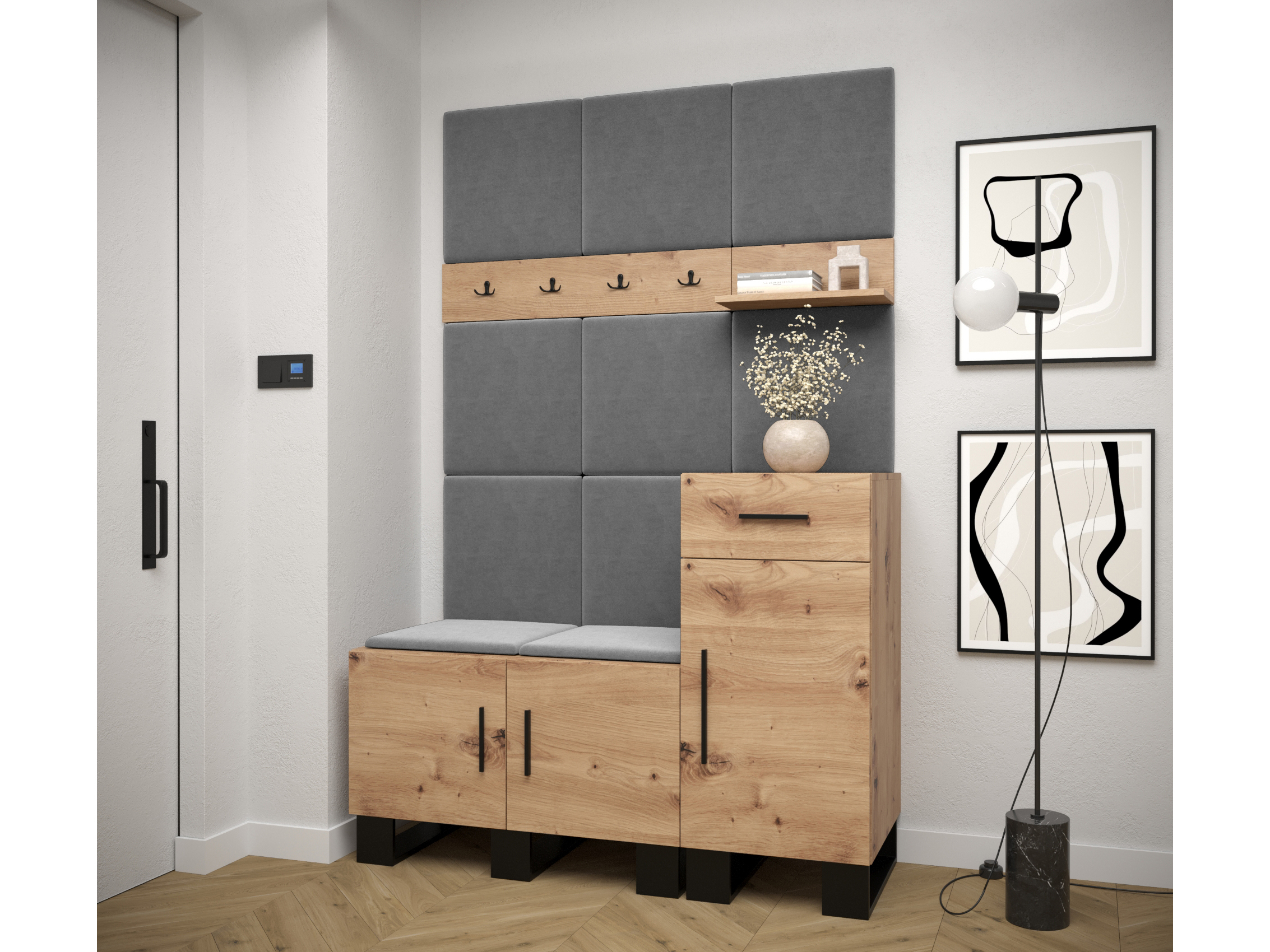 Designová předsíňová sestava Amanda se stane krásným a zejména praktickým doplňkem Vašeho interiéru. Praktický věšákový panel se s lehkostí postará o uložení či zavěšení Vašich větrovek a kabátů, do malé skříňky se vejdou Vaše boty a v komodě budete mít po ruce Vaše osobní věci a drobnosti. Sestava také obsahuje i praktickou nástěnnou polici která nabídne místo např. pro Vaše dekorace. Moderní akcent síně je zvýrazněn i čalouněnými panely, které předsíni dodávají nejen přitažlivý styl a eleganci, ale také poskytují i ochranu Vašeho nábytku před poškozením a výborné akustické vlastnosti.