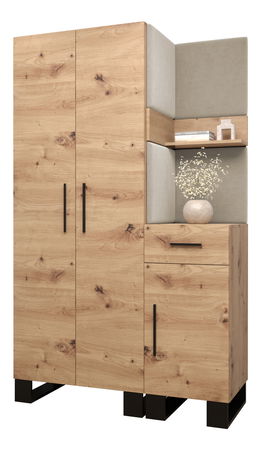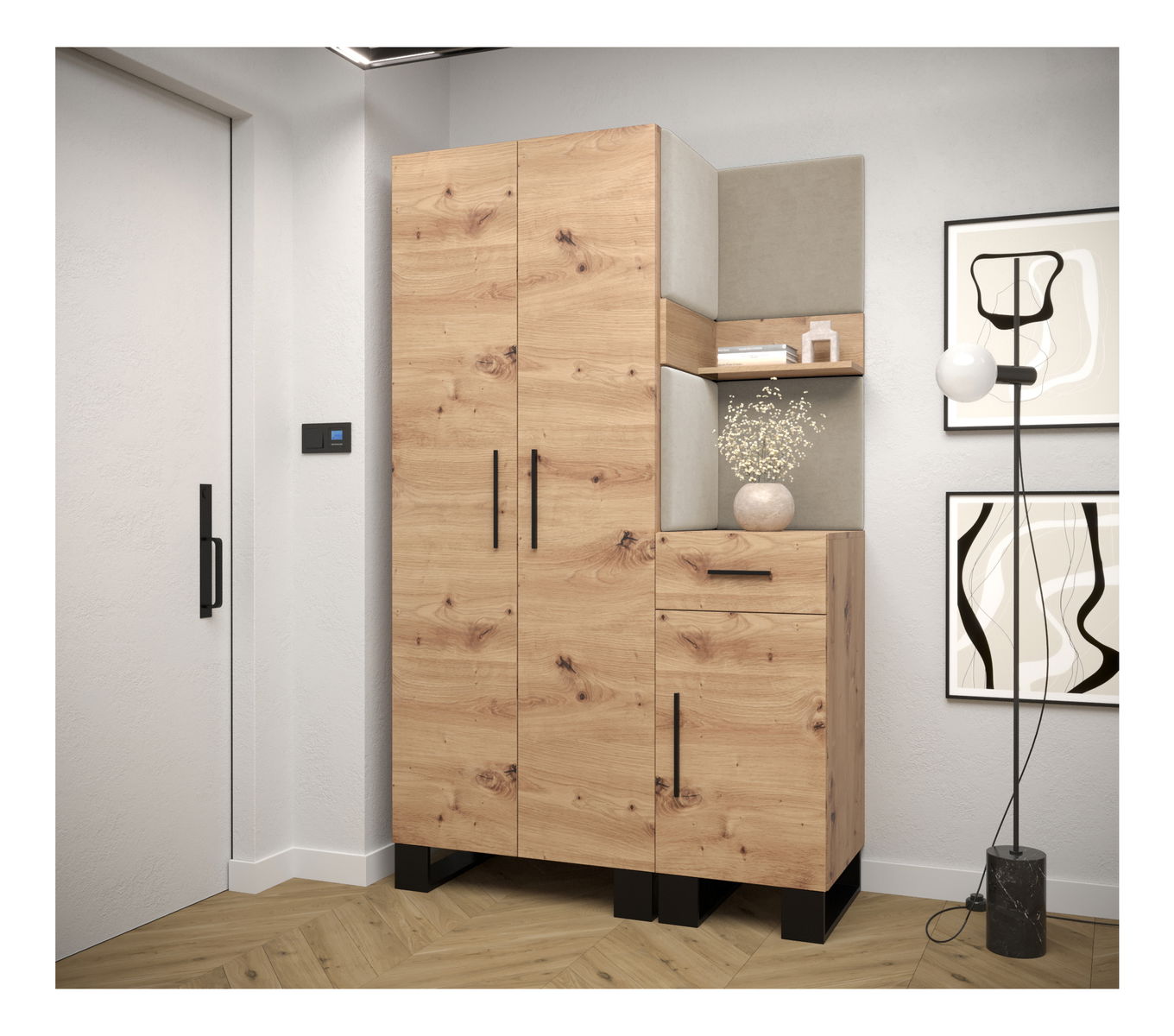 Designová předsíňová sestava Amanda se stane krásným a zejména praktickým doplňkem Vašeho interiéru. Věšáková skříň Vám nabídne úložný prostor pro zavěšení Vašeho oblečení a komoda zase prostor pro odložení Vašich osobních věcí a drobností. Praktická nástěnná police nabídne místo např. pro Vaše dekorace. Moderní akcent síně je zvýrazněn i čalouněnými panely, které předsíni dodávají nejen přitažlivý styl a eleganci, ale také poskytují i ochranu Vašeho nábytku před poškozením a výborné akustické vlastnosti.