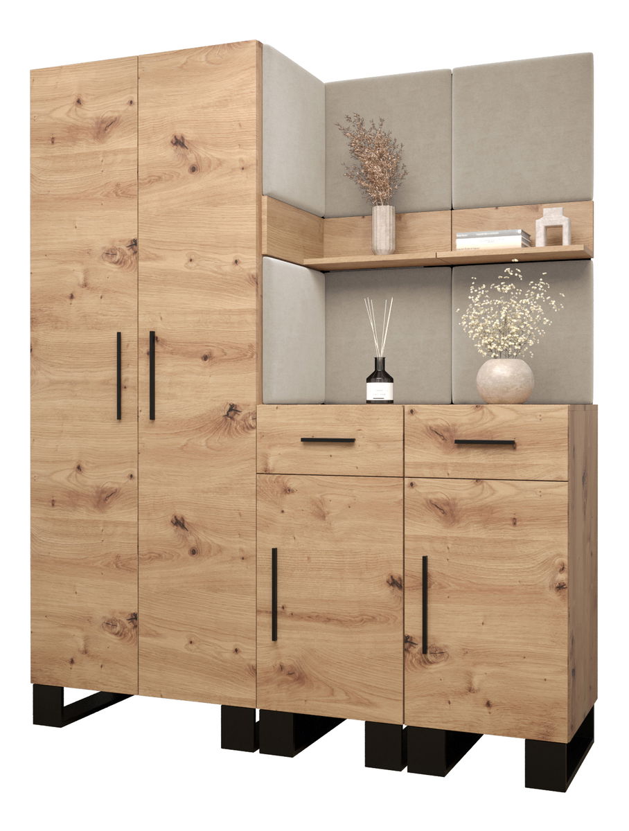Designová předsíňová sestava Amanda se stane krásným a zejména praktickým doplňkem Vašeho interiéru. Věšáková skříň Vám nabídne úložný prostor pro zavěšení Vašeho oblečení a dvojice komod zase velký prostor pro odložení Vašich osobních věcí či drobností. Dvojice praktických nástěnných polic zase nabídne místo např. pro Vaše dekorace. Moderní akcent síně je zvýrazněn i čalouněnými panely, které předsíni dodávají nejen přitažlivý styl a eleganci, ale také poskytují i ochranu Vašeho nábytku před poškozením a výborné akustické vlastnosti.