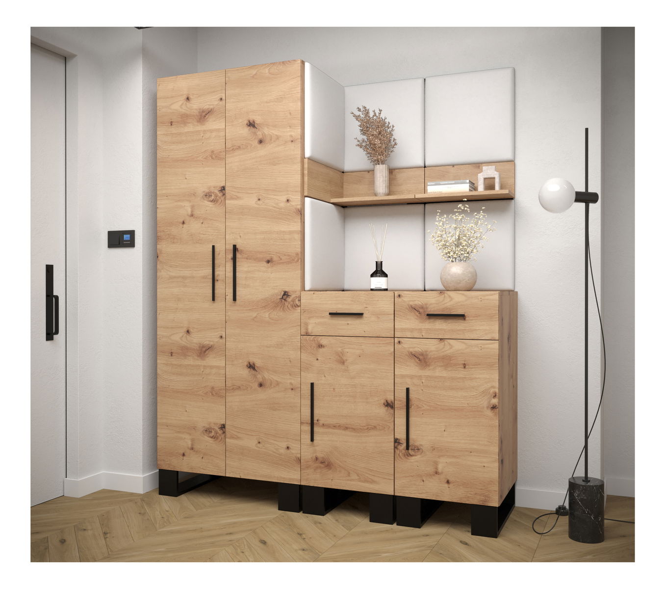 Designová předsíňová sestava Amanda se stane krásným a zejména praktickým doplňkem Vašeho interiéru. Věšáková skříň Vám nabídne úložný prostor pro zavěšení Vašeho oblečení a dvojice komod zase velký prostor pro odložení Vašich osobních věcí či drobností. Dvojice praktických nástěnných polic zase nabídne místo např. pro Vaše dekorace. Moderní akcent síně je zvýrazněn i čalouněnými panely, které předsíni dodávají nejen přitažlivý styl a eleganci, ale také poskytují i ochranu Vašeho nábytku před poškozením a výborné akustické vlastnosti.