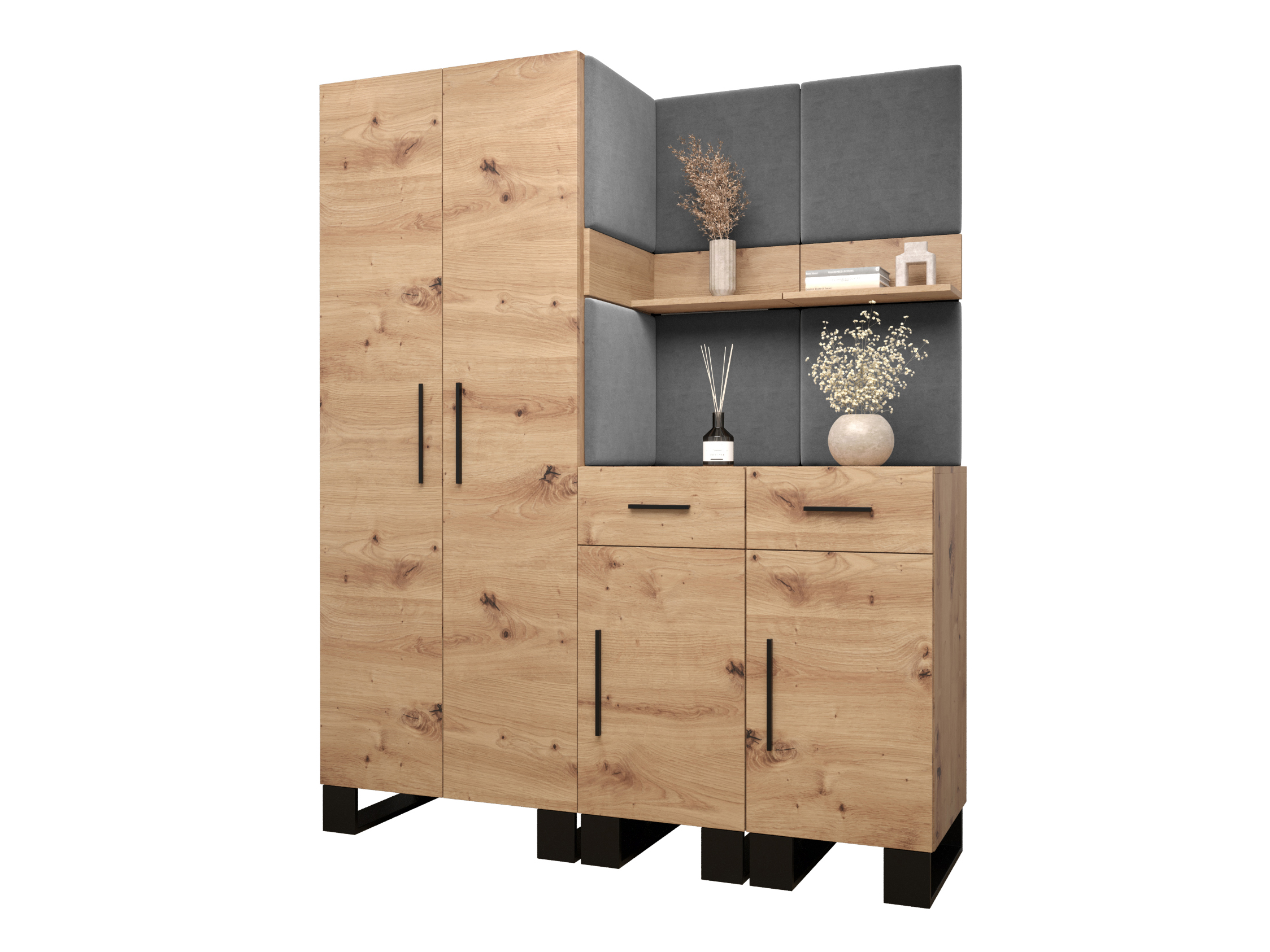 Designová předsíňová sestava Amanda se stane krásným a zejména praktickým doplňkem Vašeho interiéru. Věšáková skříň Vám nabídne úložný prostor pro zavěšení Vašeho oblečení a dvojice komod zase velký prostor pro odložení Vašich osobních věcí či drobností. Dvojice praktických nástěnných polic zase nabídne místo např. pro Vaše dekorace. Moderní akcent síně je zvýrazněn i čalouněnými panely, které předsíni dodávají nejen přitažlivý styl a eleganci, ale také poskytují i ochranu Vašeho nábytku před poškozením a výborné akustické vlastnosti.