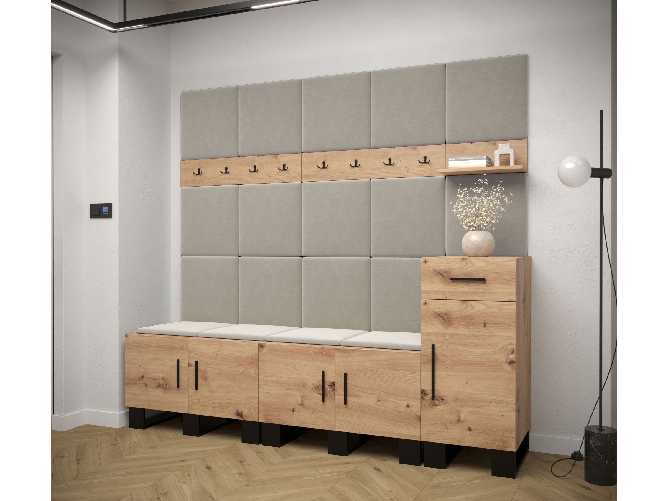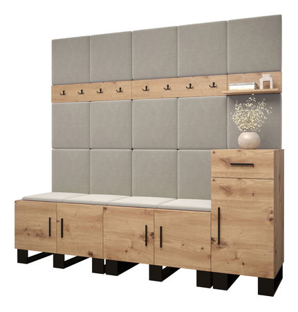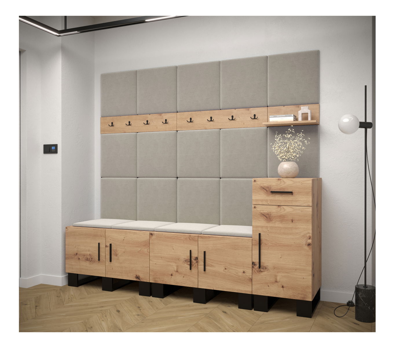Designová předsíňová sestava Amanda se stane krásným a zejména praktickým doplňkem Vašeho interiéru. Dvojice skříněk Vám nabídne obzvlášť velký prostor pro uložení Vašich bot a komoda zase prostor pro Vaše osobní věci či drobnosti. O zavěšení Vašich větrovek či kabátů se postarají dva věšákové panely. Nástěnná police zase nabídne místo např. pro Vaše dekorace. Moderní akcent síně je zvýrazněn i čalouněnými panely, které předsíni dodávají nejen přitažlivý styl a eleganci, ale také poskytují i ochranu Vašeho nábytku před poškozením a výborné akustické vlastnosti.
