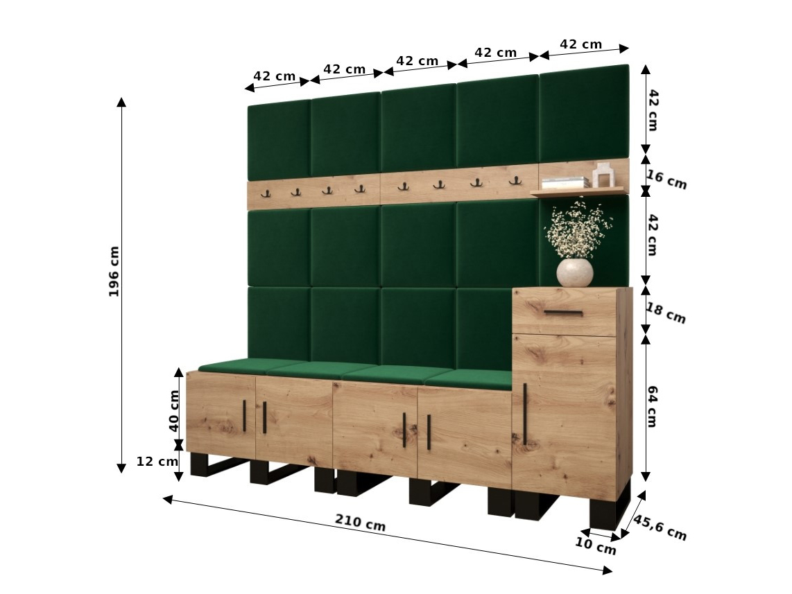 Designová předsíňová sestava Amanda se stane krásným a zejména praktickým doplňkem Vašeho interiéru. Dvojice skříněk Vám nabídne obzvlášť velký prostor pro uložení Vašich bot a komoda zase prostor pro Vaše osobní věci či drobnosti. O zavěšení Vašich větrovek či kabátů se postarají dva věšákové panely. Nástěnná police zase nabídne místo např. pro Vaše dekorace. Moderní akcent síně je zvýrazněn i čalouněnými panely, které předsíni dodávají nejen přitažlivý styl a eleganci, ale také poskytují i ochranu Vašeho nábytku před poškozením a výborné akustické vlastnosti.