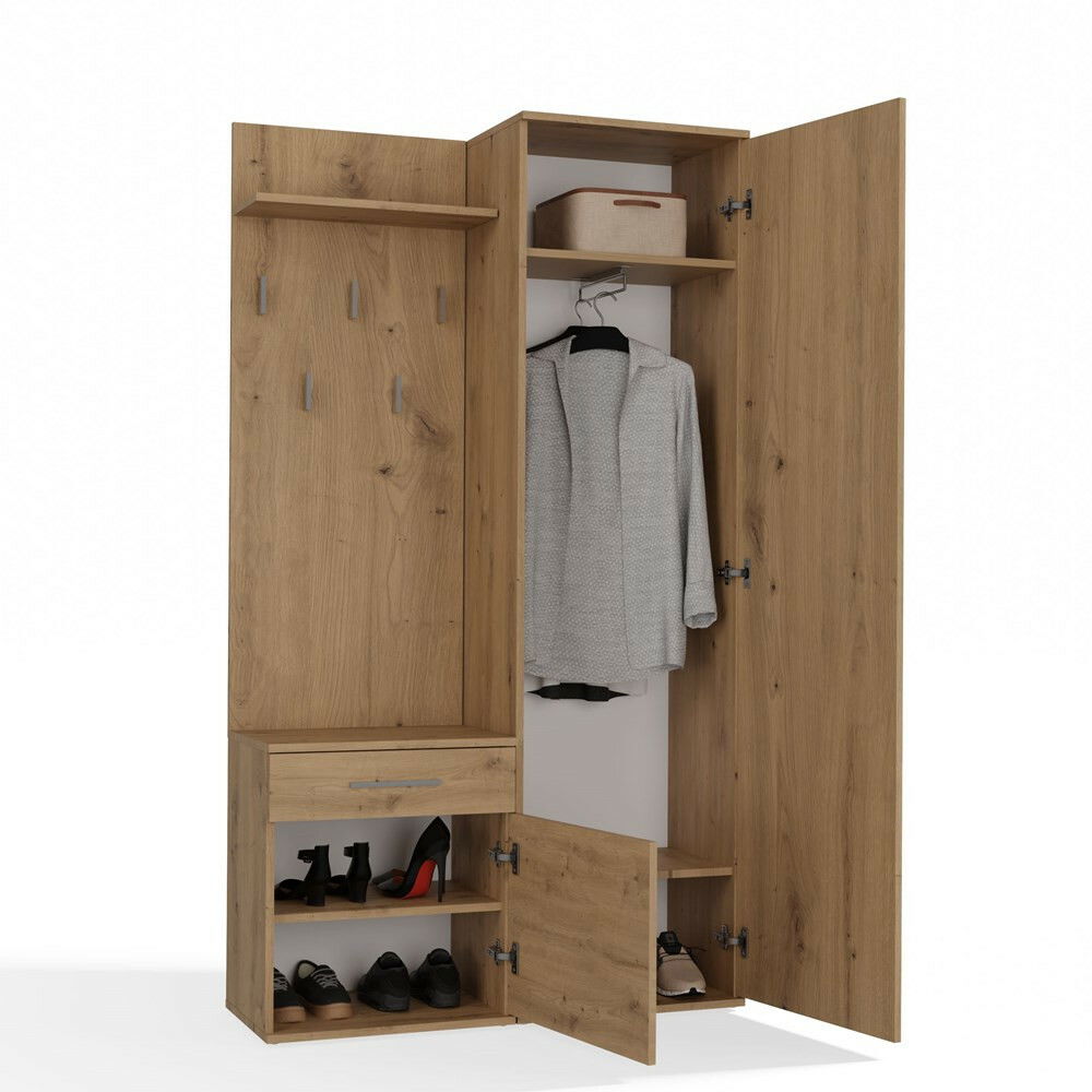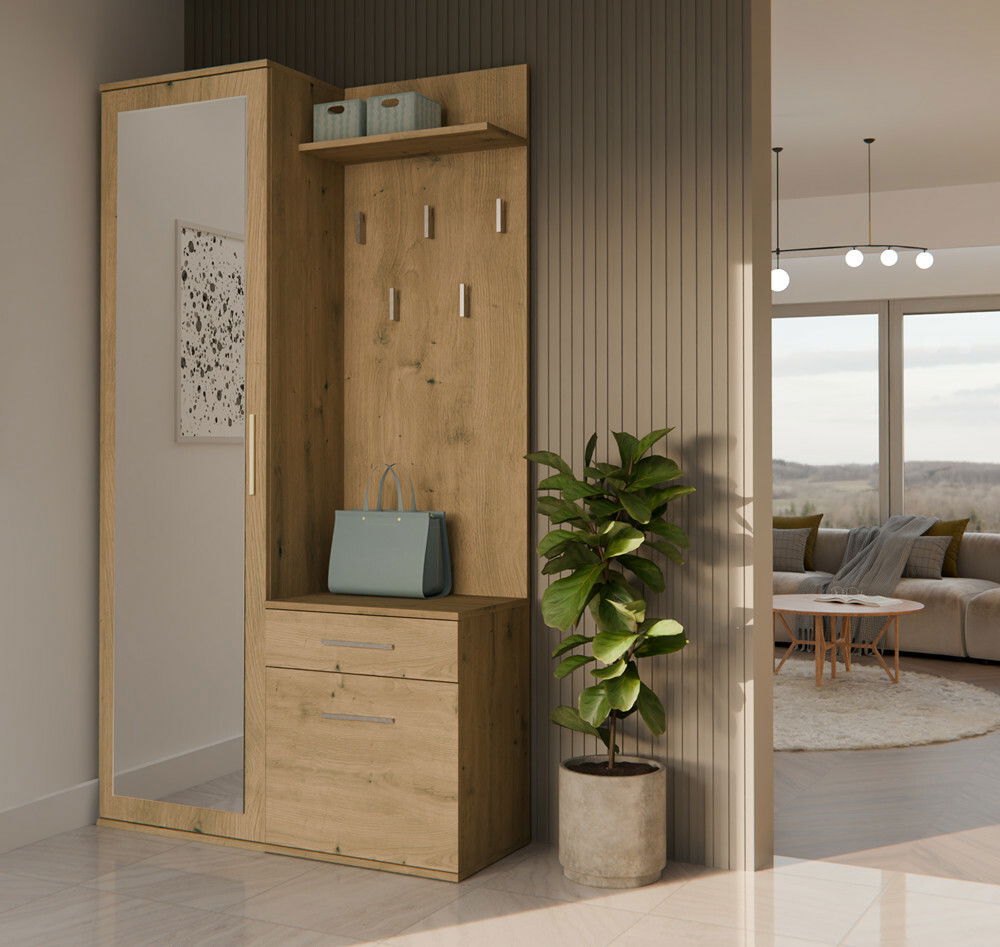 ZobrazitPředsíňová sestava Dialogos 1 v elegantní barvě dub artisan je ideálním řešením pro ty, kteří hledají kombinaci moderního designu a praktičnosti. S její velkou šatní skříní s zrcadlem, praktickým šuplíkem a menší skříní, nabízí dostatek úložného prostoru pro všechny vaše potřeby. Sestava obsahuje také věšák s poličkou, který lze umístit blízko skříněk nebo rozložit dle vlastních preferencí. Díky kvalitním materiálům a jednoduchému montážnímu systému se stane skvělým doplňkem vaší předsíně.