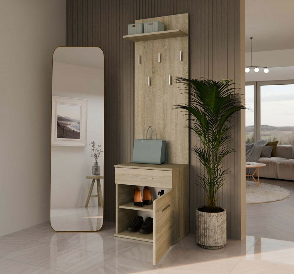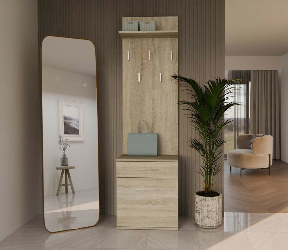 ZobrazitPředsíňová sestava Dialogos 2 v elegantní barvě dub sonoma je ideálním řešením pro ty, kteří hledají spojení moderního designu a praktičnosti. S jejím praktickým šuplíkem a pěti věšáky s poličkou nabízí dostatek prostoru pro uskladnění obuvi a dalších potřebných věcí. Korpus a fronty jsou vyrobeny z kvalitní laminované dřevotřísky, což zaručuje dlouhou životnost a odolnost vůči mechanickému poškození. Tato sestava je nejen funkční, ale také esteticky příjemná, čímž skvěle doplní každý interiér.