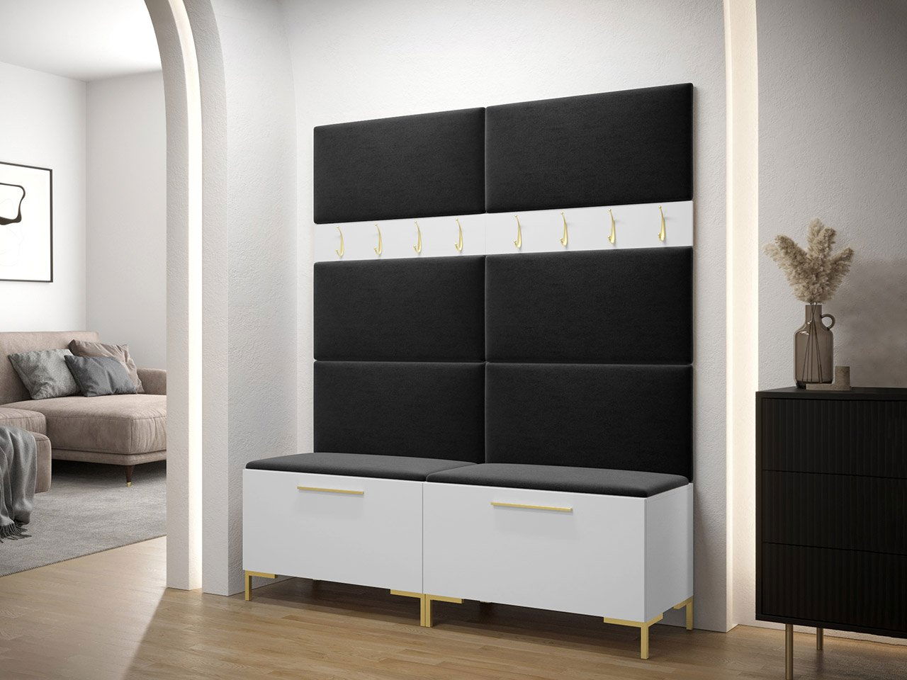 Skříň na boty Frunofta x2: šířka: 84 cm, výška: 52 cm, hloubka: 46 cm, Věšák na šaty 84 Frunofta x2: šířka: 84 cm, výška: 16 cm, Čalouněný panel Pag 84x42: x8 šířka: 84 cm, výška : 42 cm, hloubka: 4 cm