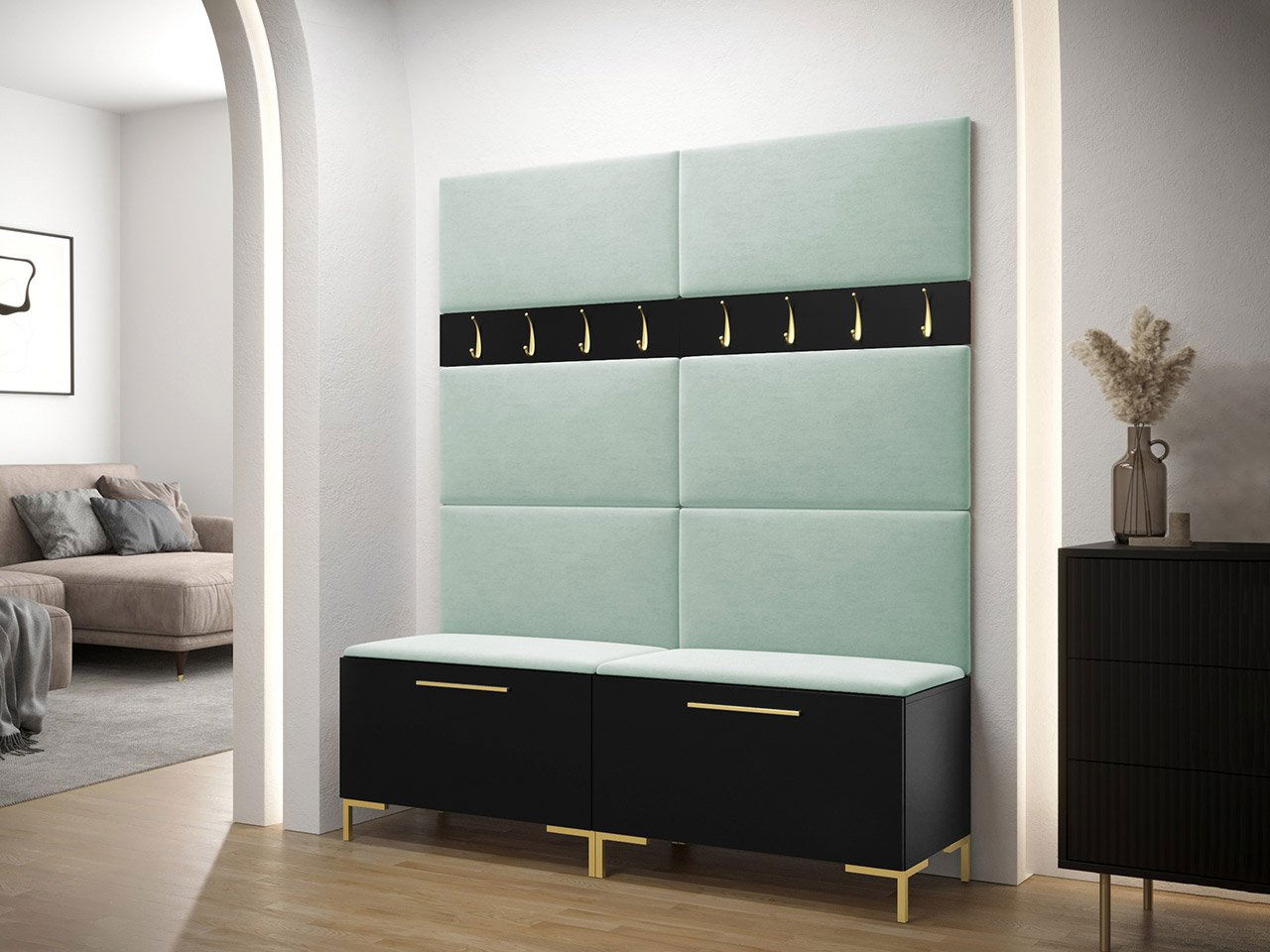 Skříň na boty Frunofta x2: šířka: 84 cm, výška: 52 cm, hloubka: 46 cm, Věšák na šaty 84 Frunofta x2: šířka: 84 cm, výška: 16 cm, Čalouněný panel Pag 84x42: x8 šířka: 84 cm, výška : 42 cm, hloubka: 4 cm