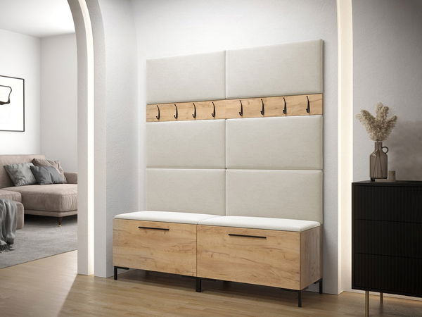 Skříň na boty Frunofta x2: šířka: 84 cm, výška: 52 cm, hloubka: 46 cm, Věšák na šaty 84 Frunofta x2: šířka: 84 cm, výška: 16 cm, Čalouněný panel Pag 84x42: x8 šířka: 84 cm, výška : 42 cm, hloubka: 4 cm