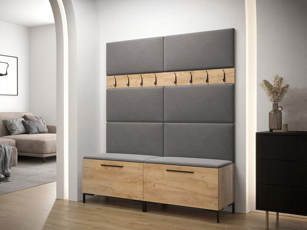 Skříň na boty Frunofta x2: šířka: 84 cm, výška: 52 cm, hloubka: 46 cm, Věšák na šaty 84 Frunofta x2: šířka: 84 cm, výška: 16 cm, Čalouněný panel Pag 84x42: x8 šířka: 84 cm, výška : 42 cm, hloubka: 4 cm