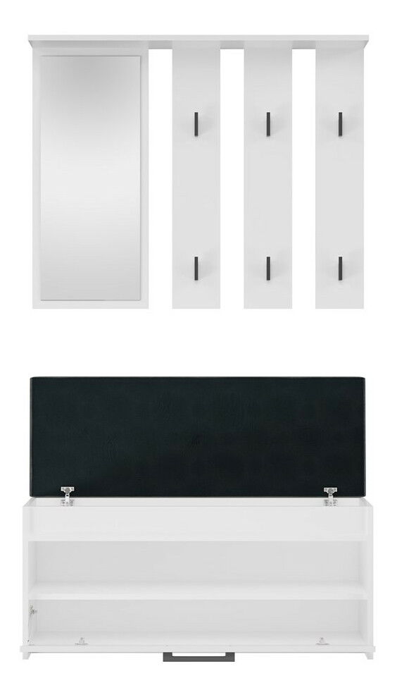 ZobrazitPředsíňová sestava Puntuable 1 v elegantní bílé barvě je ideálním řešením pro moderní interiéry, které kombinují funkčnost s estetikou. Tento praktický nábytek obsahuje šest stylových černých věšáků na oděv, zrcadlo a speciální skříň na obuv se sezením a úložným prostorem, což zaručuje pohodlné a přehledné uspořádání vašich věcí. Korpus a fronty jsou vyrobeny z odolné laminované dřevotřísky, což zajišťuje dlouhou životnost a snadnou údržbu. S touto síňovou sestavou si vytvoříte útulný a praktický vstup do vašeho domova.
