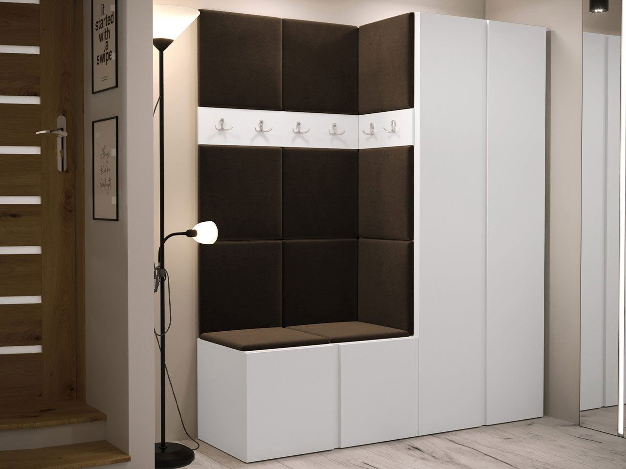 Moderní šatní skříň Timothy je základem pro módní design chodby a předsíně. Jeho umístěním hned vedle dveří si můžete být jisti, že po příchodu domů vás vždy přivítá efektně a prakticky vyzdobená místnost. Maximální funkčnost těchto kusů nábytku zvýhodňuje kombinace šatní skříně s botníkem. Taková kombinace poskytuje optimální prostor pro oblečení i boty a sportovní vybavení. Čalouněné panely dodávají nábytku předsíně zajímavý vzhled. K dispozici v několika barvách, lemují stěny a také vytvářejí oporu, která usnadňuje obouvání bot. Celek doplňuje panel s věšáky - chytré místo k zavěšení bund a kabátů hostů.