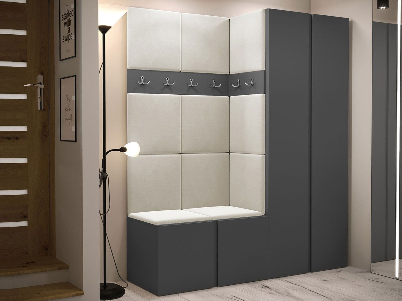ZobrazitModerní šatní skříň Timothy je základem pro módní design chodby a předsíně. Jeho umístěním hned vedle dveří si můžete být jisti, že po příchodu domů vás vždy přivítá efektně a prakticky vyzdobená místnost. Maximální funkčnost těchto kusů nábytku zvýhodňuje kombinace šatní skříně s botníkem. Taková kombinace poskytuje optimální prostor pro oblečení i boty a sportovní vybavení. Čalouněné panely dodávají nábytku předsíně zajímavý vzhled. K dispozici v několika barvách, lemují stěny a také vytvářejí oporu, která usnadňuje obouvání bot. Celek doplňuje panel s věšáky - chytré místo k zavěšení bund a kabátů hostů.