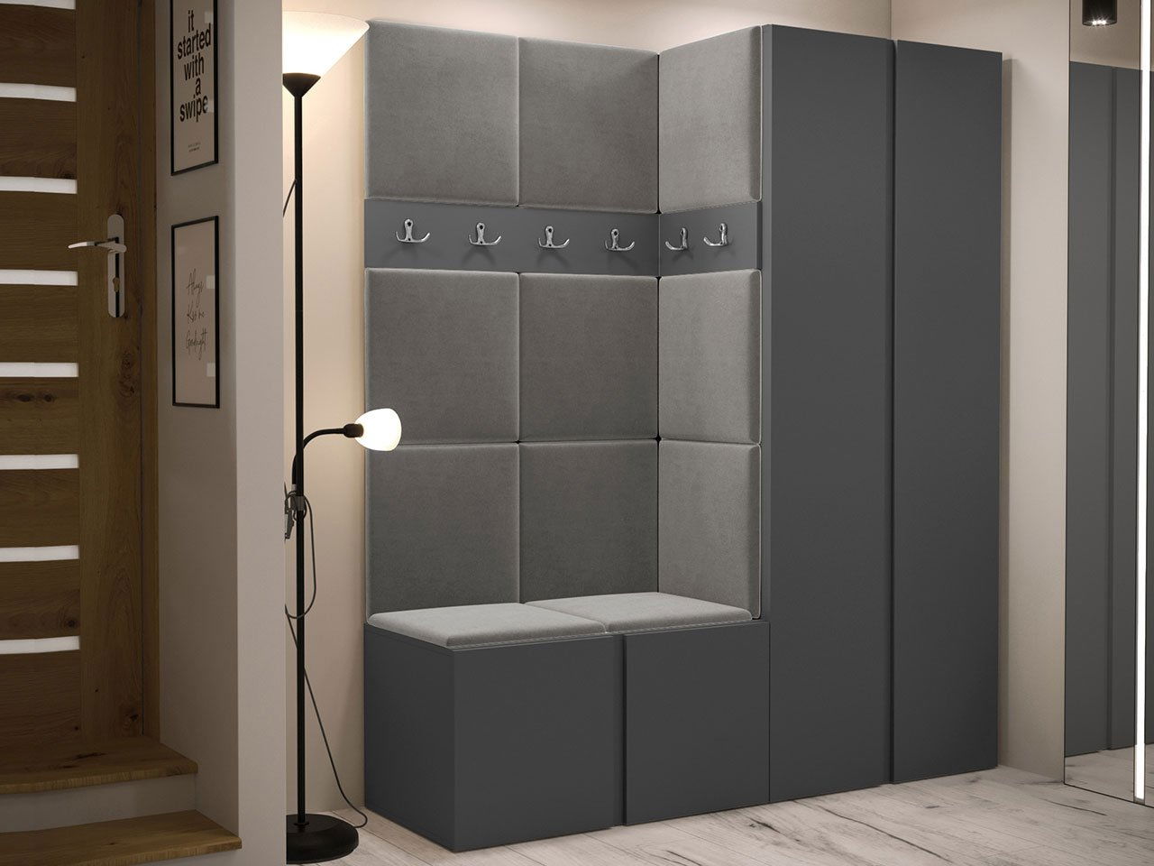 ZobrazitModerní šatní skříň Timothy je základem pro módní design chodby a předsíně. Jeho umístěním hned vedle dveří si můžete být jisti, že po příchodu domů vás vždy přivítá efektně a prakticky vyzdobená místnost. Maximální funkčnost těchto kusů nábytku zvýhodňuje kombinace šatní skříně s botníkem. Taková kombinace poskytuje optimální prostor pro oblečení i boty a sportovní vybavení. Čalouněné panely dodávají nábytku předsíně zajímavý vzhled. K dispozici v několika barvách, lemují stěny a také vytvářejí oporu, která usnadňuje obouvání bot. Celek doplňuje panel s věšáky - chytré místo k zavěšení bund a kabátů hostů.