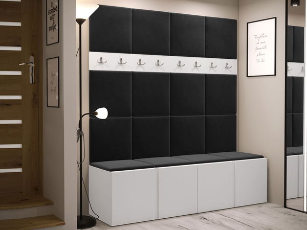 Skříňka na boty x2: šířka: 84 cm, výška: 42 cm, hloubka: 46 cm, Věšák na šaty 84 x2: šířka: 84 cm, výška: 16 cm, hloubka: 4,6 cm, Čalouněný panel Pag 42x42: (x16 ) šířka: 42 cm, výška: 42 cm, hloubka: 4 cm