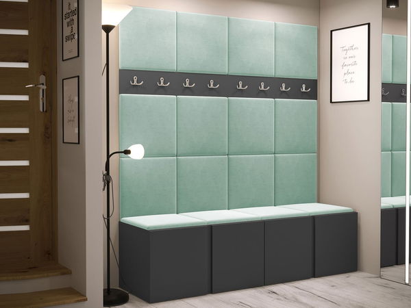Skříňka na boty x2: šířka: 84 cm, výška: 42 cm, hloubka: 46 cm, Věšák na šaty 84 x2: šířka: 84 cm, výška: 16 cm, hloubka: 4,6 cm, Čalouněný panel Pag 42x42: (x16 ) šířka: 42 cm, výška: 42 cm, hloubka: 4 cm