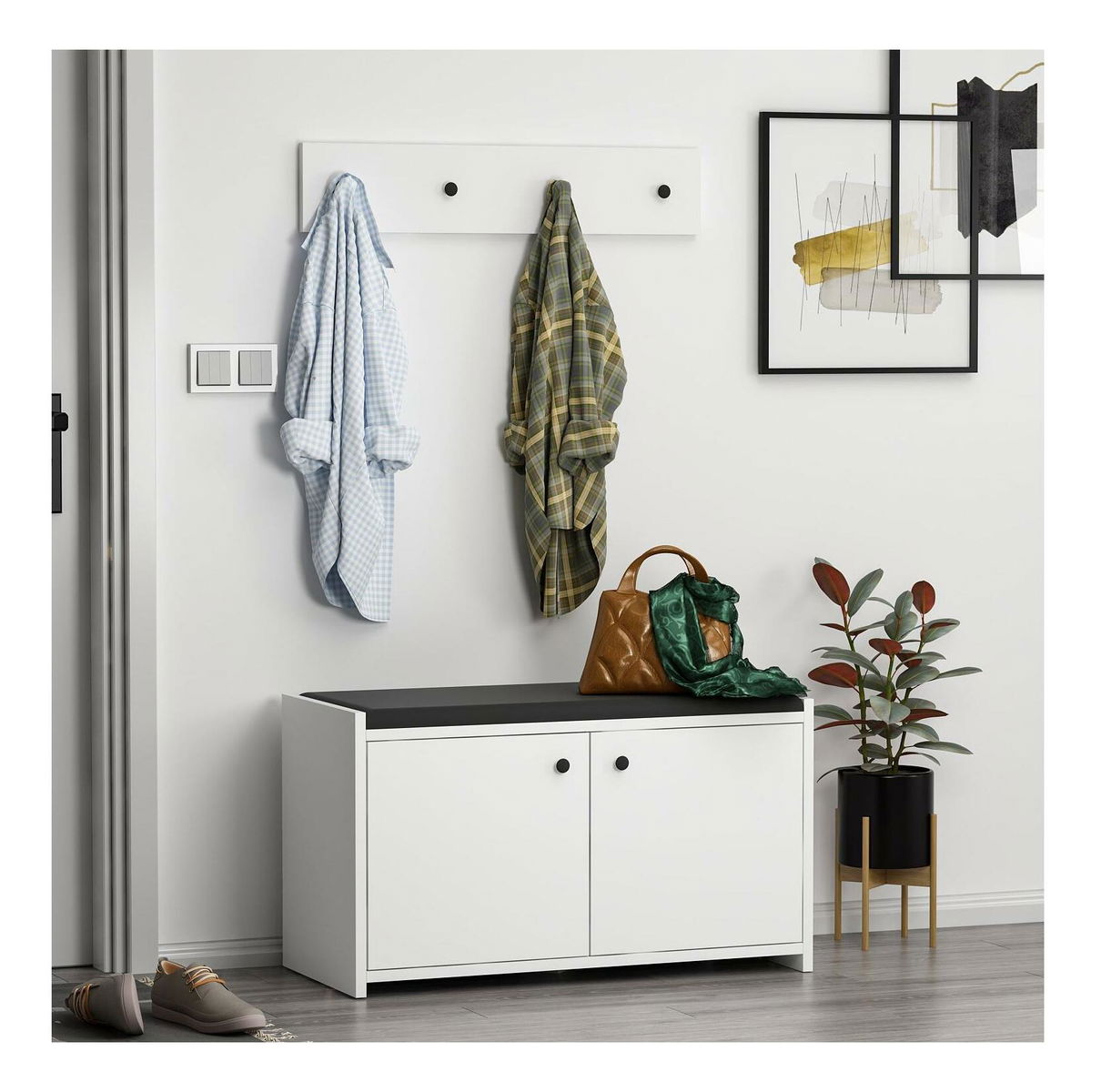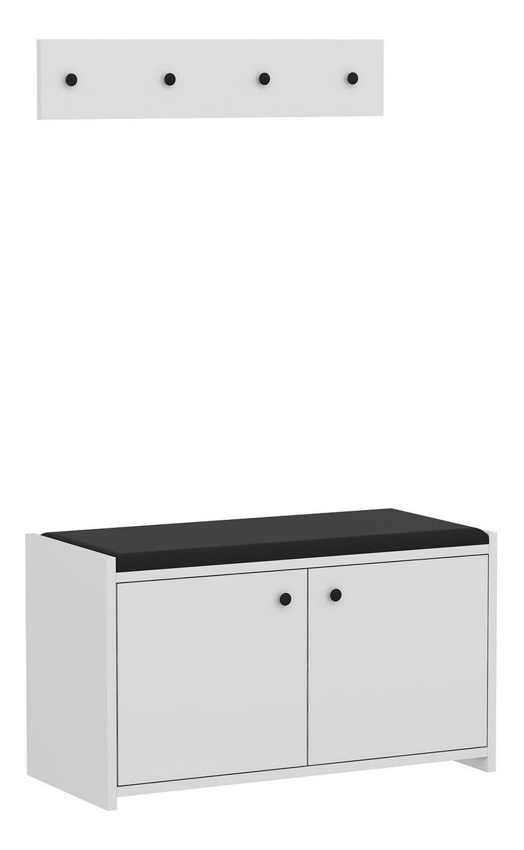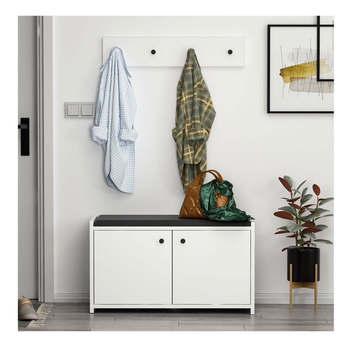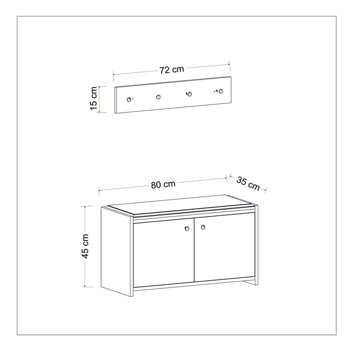 tloušťka: 18 mm, malba sušená v elektrostatické troubě olepování PVC skříňka: šířka: 80 cm, výška: 45 cm, hloubka: 35 cm, 2 zásuvky věšák: šířka: 72 cm, výška: 15 cm