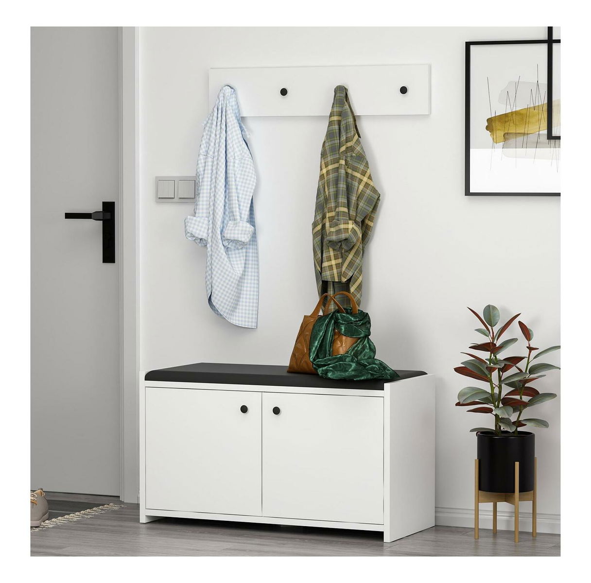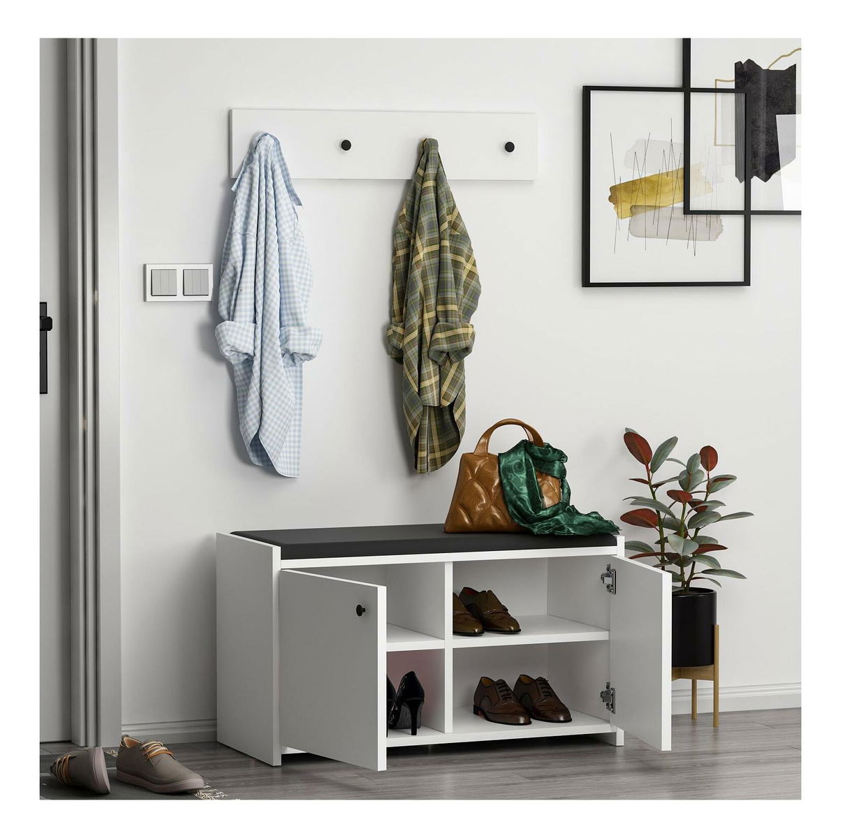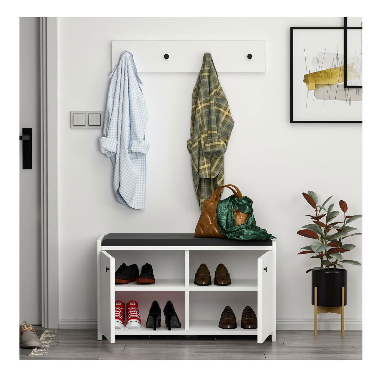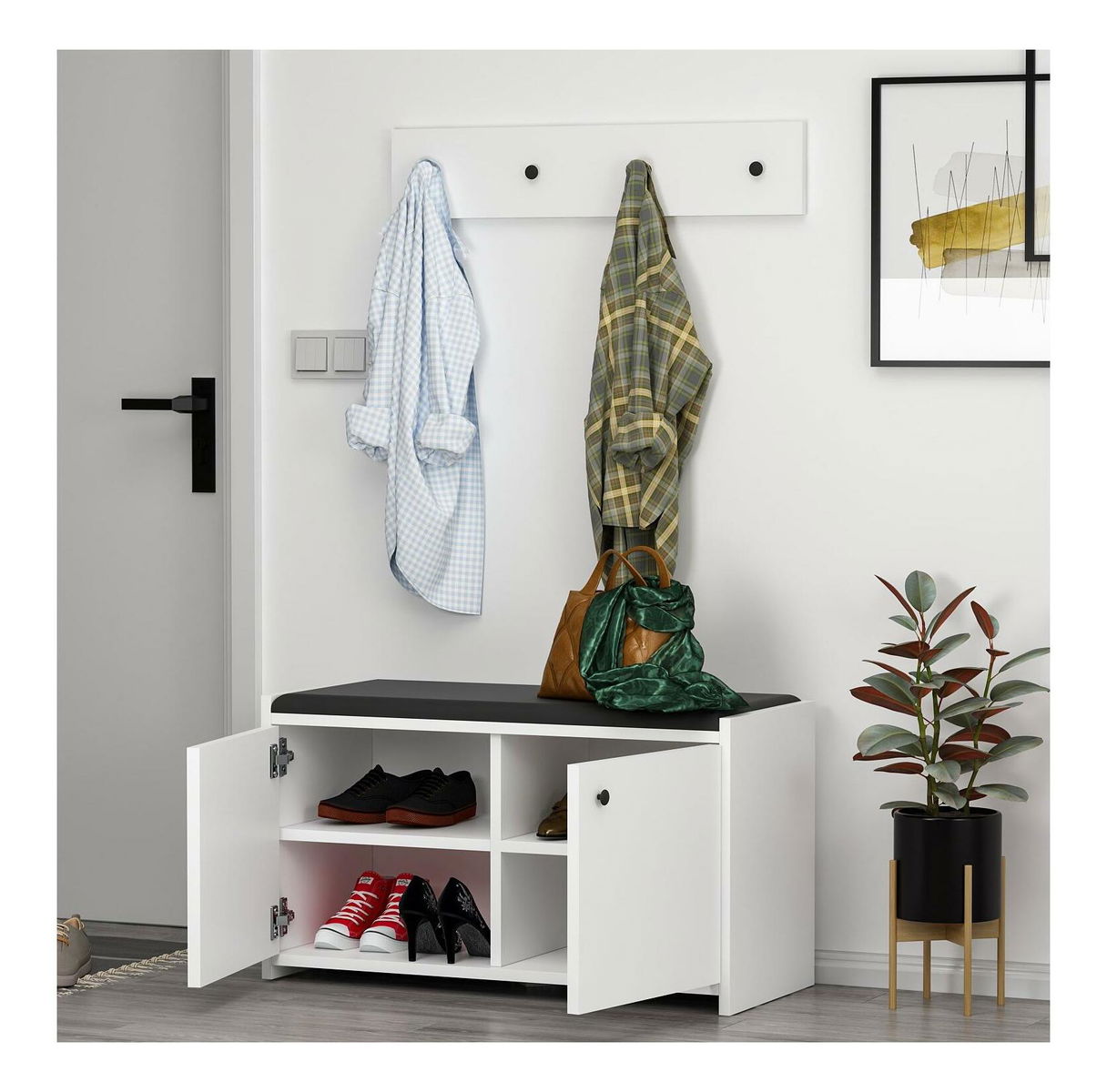 tloušťka: 18 mm, malba sušená v elektrostatické troubě olepování PVC skříňka: šířka: 80 cm, výška: 45 cm, hloubka: 35 cm, 2 zásuvky věšák: šířka: 72 cm, výška: 15 cm