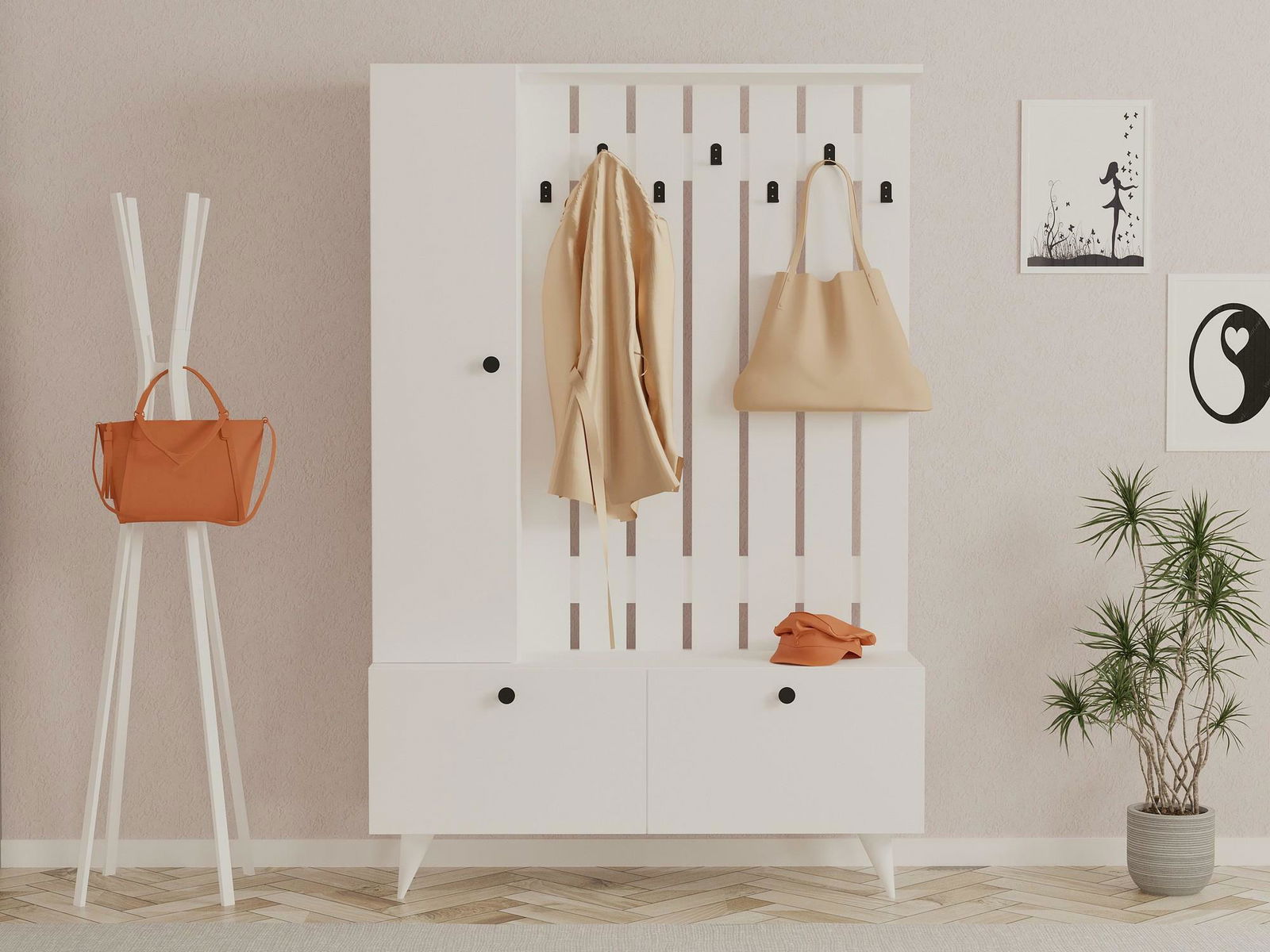 Víceúčelový závěsný stojan. Na stěnu lze upevnit množství polic Další úložné prostory.