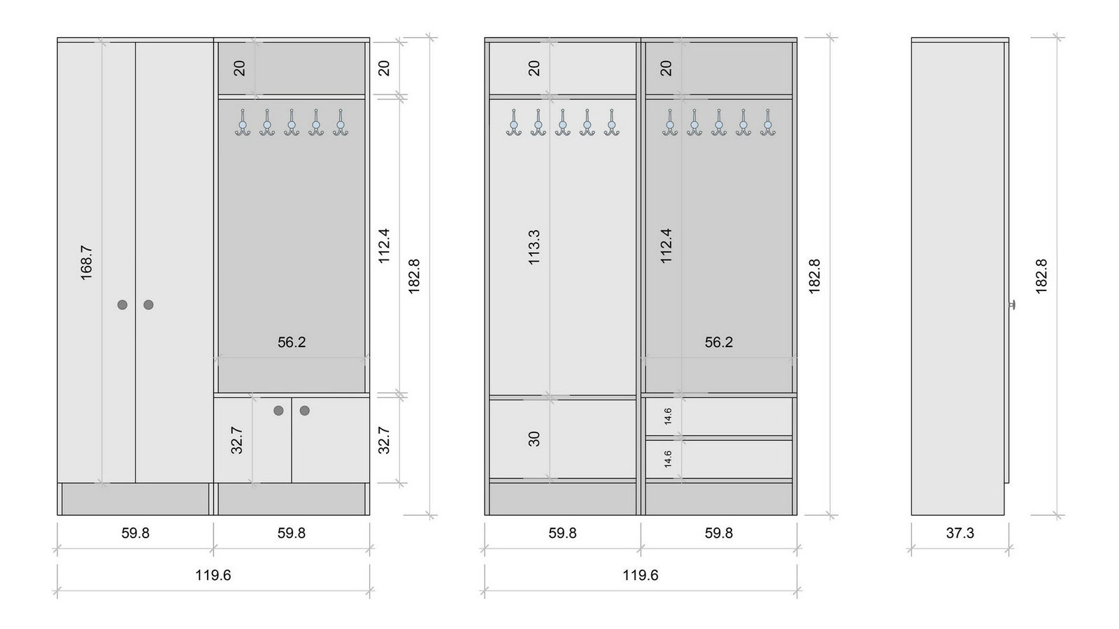 šířka: 119,6 cm výška: 182,8 cm hloubka: 37,3 cm