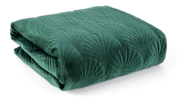 Dodejte své ložnici nový svěží vzhled s novým přehozem přes postel. Přehoz vaši postel ochrání před zašpiněním a prachem. V chladných dnech vám poslouží i jako náhrada deky. Kromě toho se jedná o vkusný bytový textil, díky kterému bude vaše ložnice ještě útulnější. Přehoz RIA v sametové tmavě zelené barvě zaručí pocit luxusu. Povrch přehozu je sametový se vzorem art deco vějířů.