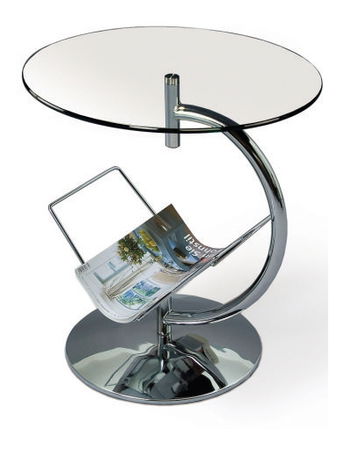 Moderní příruční stolek s elegantním designem je chromové konstrukce a vrchní kruhová deska je skleněná. Pod ní se nachází praktický stojan na noviny.