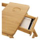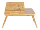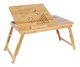 Odkládací stolek na notebook z bambusu nabízí praktické a estetické řešení pro práci i odpočinek. Deska je rozdělena na dvě části, z nichž jedna je nastavitelná do různých úhlů a vybavena větracími otvory pro lepší chlazení zařízení, doplněná o zarážku proti sklouznutí. Druhá část slouží jako pevná plocha s výřezem pro umístění šálku nebo drobných předmětů. Pevné skládací nohy umožňují snadné přenášení a skladování, přičemž bambusové provedení zajišťuje stabilitu a přírodní vzhled. Stolek je ideální pro použití v posteli, na pohovce nebo na podlaze, přičemž jeho rozměry a nosnost odpovídají běžným potřebám domácího i kancelářského využití.