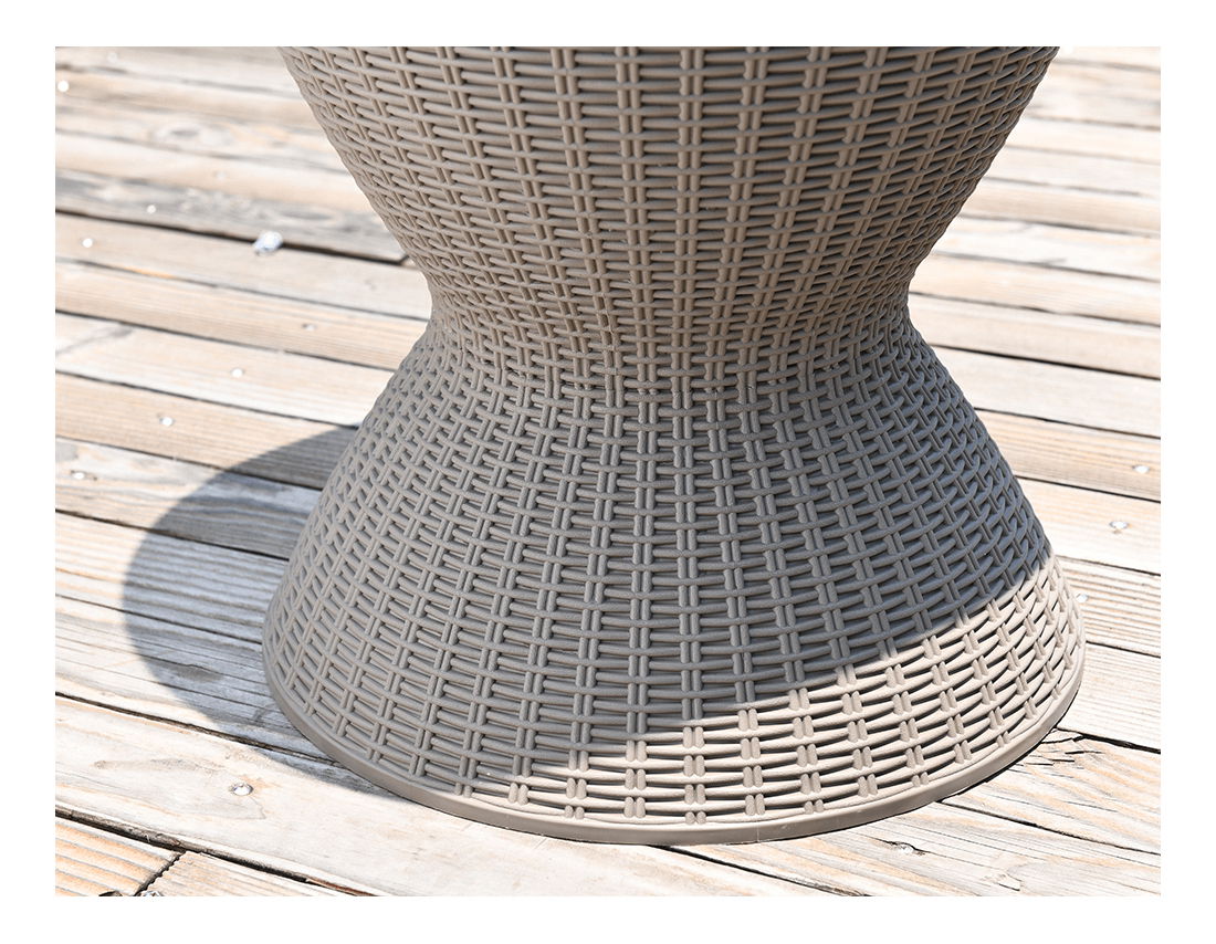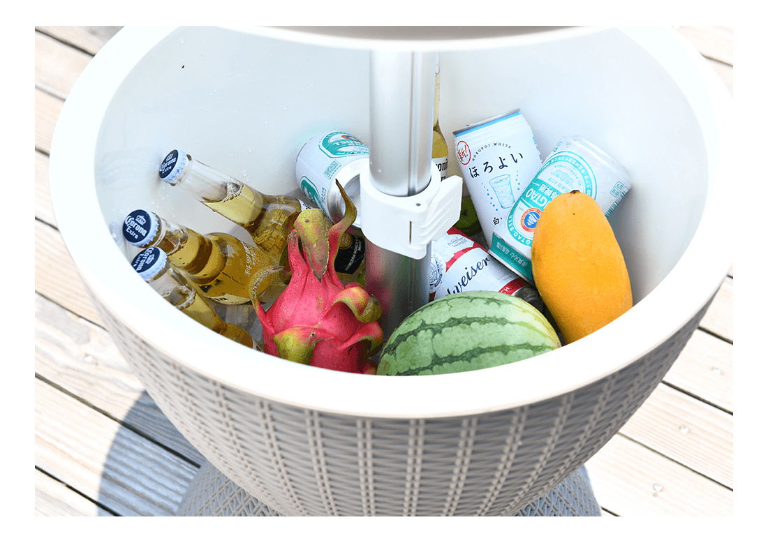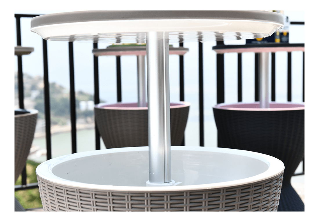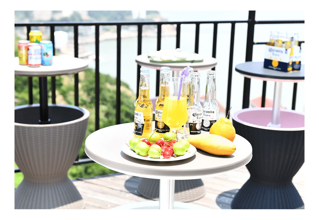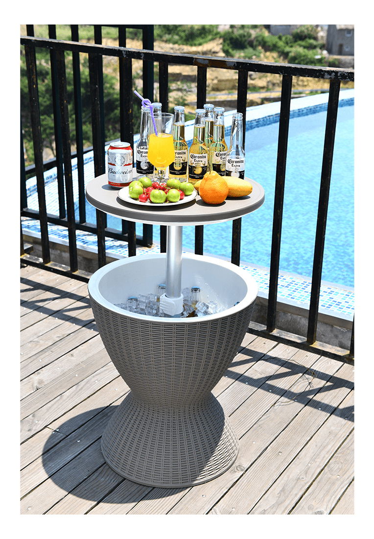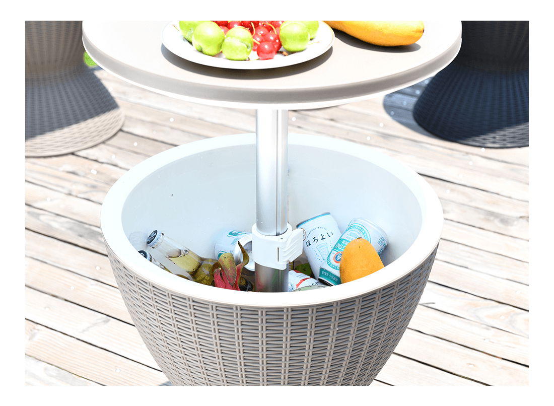 Multifunkční a trendy Fybir chladící zahradní stolek je stolek mnoha tváří. Ve složeném stavu slouží jako praktický příruční či konferenční stolek. Stačí vytáhnout vrchní desku a stolek se najednou promění v chladící bar. Často se označuje jako cool bar. Tento atraktivní koktejlový zahradní stolek s boxem pro chlazení nápojů vám vyhoví po každé stráně. Stolek využijete k servírování nápojů a pochutin k zahradnímu nábytku nebo k lehátkům, i jako barový pult, pokud jde o akci, kde pozvaní hosté většinou stojí. Výhodou je, že nemusíte odbíhat po chlazené nápoje do chladničky. Stačí do spodní části přidat led, nápoj si udrží svoji správnou teplotu po dlouhou dobu. Fybir má elegantní ratanový vzhled. Vyroben je z plastu (polypropylen) šedé barvy. Výbornou vlastností je nastavitelná výška servírovací plochy. Ve sklopené formě má stolek výšku 57 cm, po vytažení stolku má výšku až 81,7 cm.