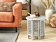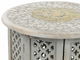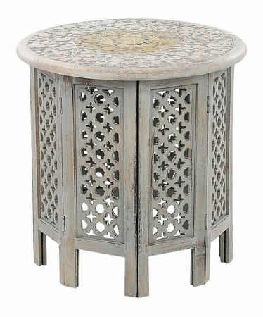 Tento ručně vyrobený příruční stolek v sobě spojuje krásu vintage stylu s prvky orientálního designu. Kulato vrchní desku zdobí květinový motiv, zatímco osmihranný podstavec je zdoben mřížkovaným vzorem, který mu dodává nevšední kouzlo. Tento praktický a zároveň dekorativní kousek krásně vynikne vedle pohovky nebo postele.