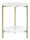 Vylepšete vzhled svého interiéru tímto stylovým příručním stolkem, který se stane středobodem každého obývacího pokoje. Stolová deska v krásném provedení s efektem mramoru je doplněna praktickou policí ve spodní části. Zlatý kovový rám zajišťuje stabilitu a pevnost konstrukce. Tento stolek je ideální do interiérů v moderním a glamour stylu.