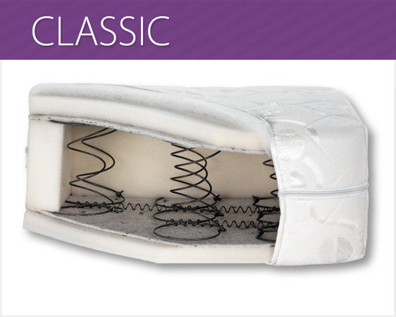 Jádro matrace CLASSIC tvoří bonellové pružiny vyrobené z vysoce kvalitního drátu o průměru 2,2 mm. Pružinové jádro je z obou stran překryté čalouněnou vložkou a polyuretanovou pěnou T25/20 mm se zvýšenou pružností. Matrace je vysoká přibližně 16 cm.