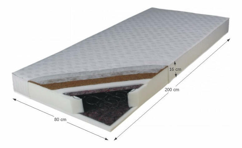 Jádro matrace tvoří kvalitní bonelové pružiny, které jsou obložené z obou stran latexovou kokosovou deskou, polyuretanovou pěnou T25-15 mm a stlačenou plstí. Potah je vyroben z čalounické látky, oboustranně prošívaný protialergickým jokem 80 g/m². Matrace je tvrdá díky použití latexové desky. Nosnost je do 100 kg.