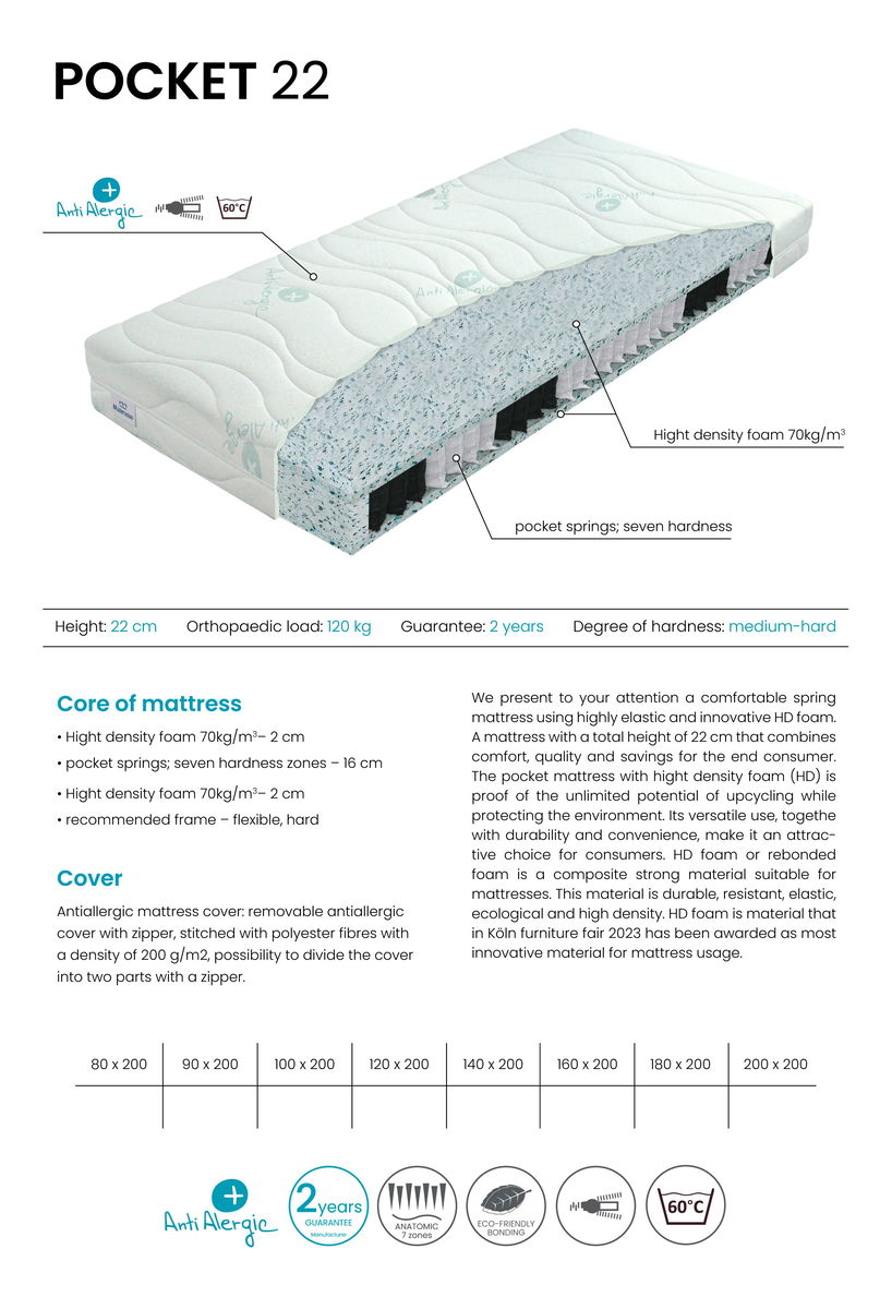Hledáte kvalitní pružinovou matraci která Vám vydrží celá léta? Jste alergik? Tak matrace Pocket 22 je pro Vás jako stvořená! Se svým antialergickým potahem a typem pěny HD o hustotě 70kg/m³ se ráno vzbudíte dokonale odpočatý/á!