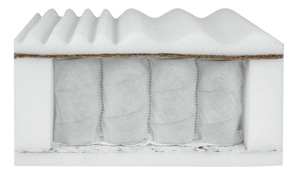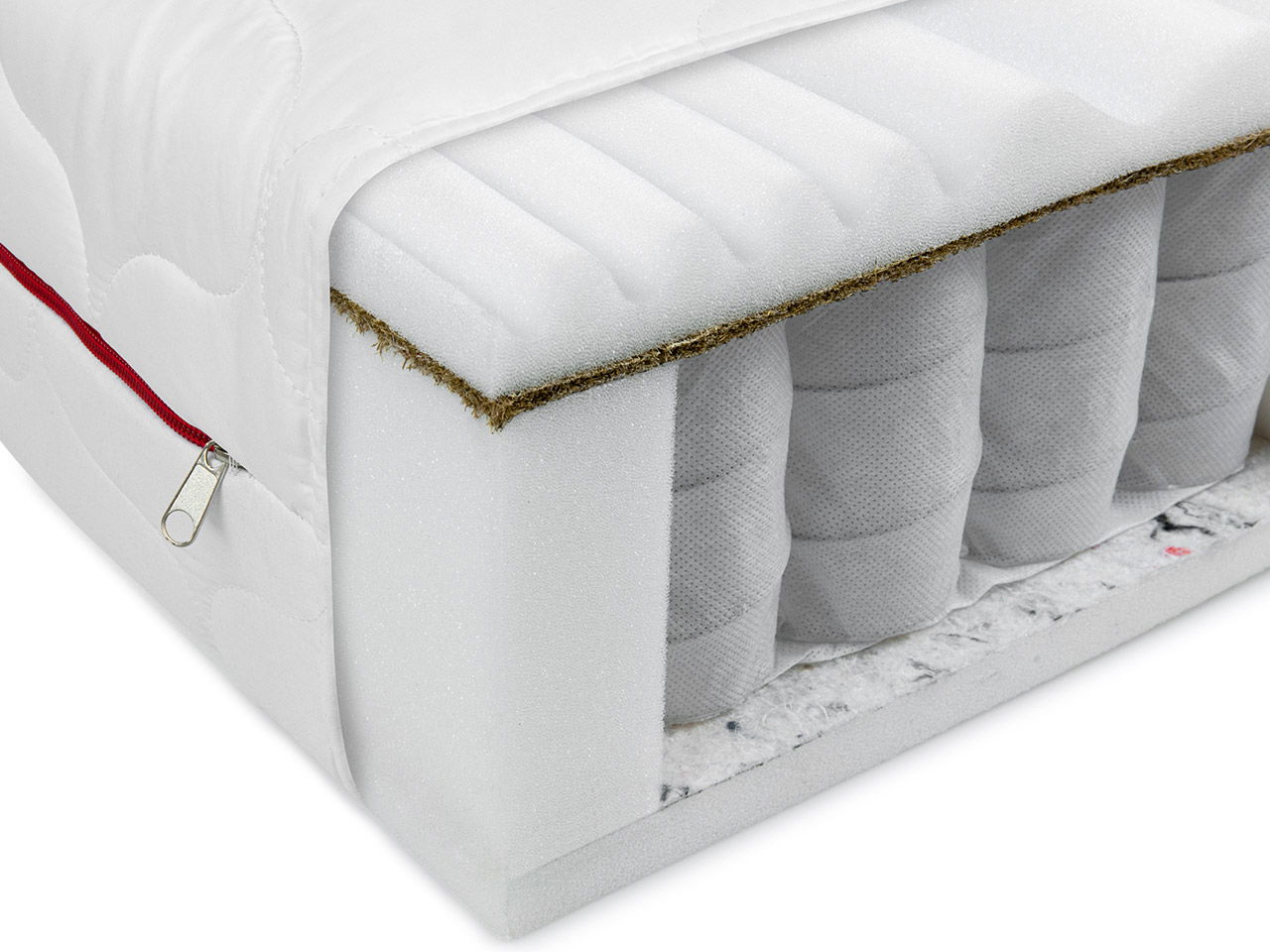 taštičkové pružiny 7 zón, povlak prošívaný klimatizačním vláknem, latex prošívaný kokosovým vláknem, 7 zónová masážní pěna - H3, vysoce elastická pěna - H2, verze H2/H3.