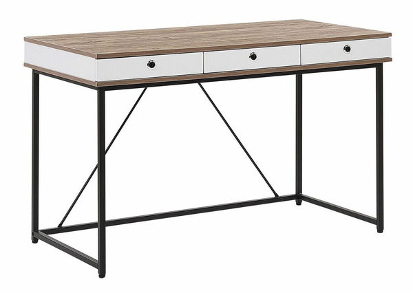 Tento funkční psací stůl do domácí kanceláře je nádherným spojením jednoduchého designu a elegance. Má širokou vrchní desku s povrchovou úpravou ze světlého dřeva a tři prostorné zásuvky s bílými předními stranami. Jednoduchý kovový rám v černé barvě dodává stolu vizuální lehkost. Díky svému minimalistickému vzhledu stůl dokonale zapadne do každé domácí kanceláře, přičemž jej lze použít i jako dekorativní prvek v ložnici nebo obýváku.