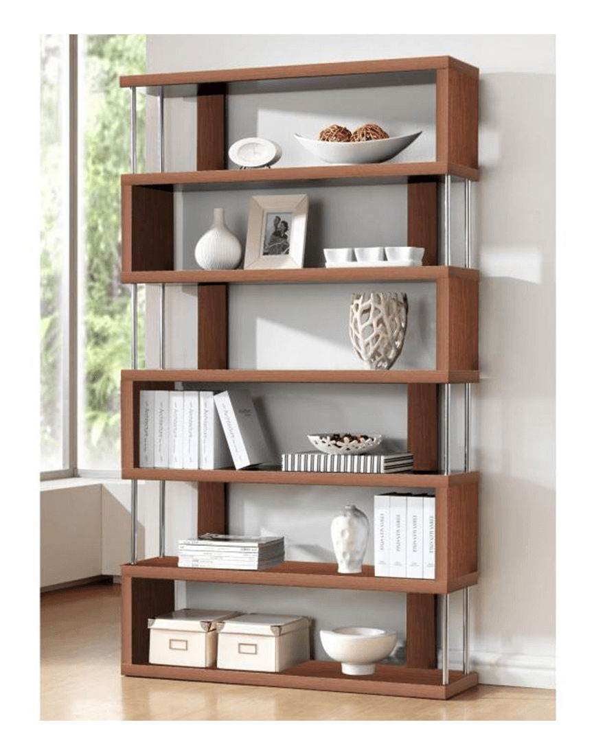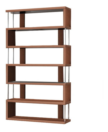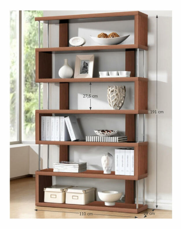 Moderní víceúčelový regál má zajímavý design a nabízí spoustu odkládacího prostoru. Korpus je hrubý 36 mm a je v barevném provedení dřeva třešeň americká. Elegantně ho doplňují kovové tyčky stříbrné barvy.