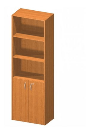 Vysoký regál v barevném provedení třešeň. V horní části se nachazejí dvě poličky a ve spodní části dvířka s možností uzamčení. Spodní prostor za dvířky obsahuje jednu poličku.