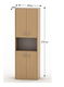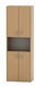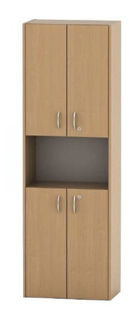 Vysoký regál v barevném provedení buk má v horní i dolní části dvířka s možností uzamčení. V prostoru za dvířky se nachází jedna polička a uprostřed jeden otevřený odkládací prostor.