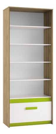 Regál s otevřenými policemi a zásuvkou v dolní části. Ta má posílené dno, pro zvýšení nosnosti.