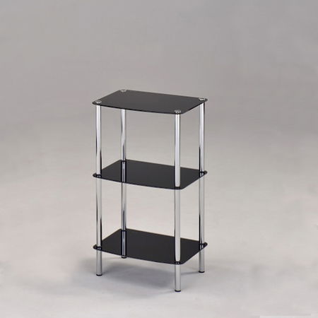 Moderní regál, který vám poslouží na odkládání různých drobností, doplňků nebo i dekorací. Konstrukce je z chromu a odkládací poličky jsou vyrobeny z černého tvrzeného skla. Regál má tři odkládací poličky a je v černém barevném provedení.