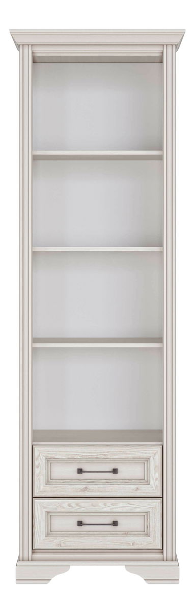 Vysoký regál na odkládání fotografií, suvenýrů či oblíbených knih Vám zkrášlí obývací pokoj nebo pracovnu. K dispozici máte čtyři otevřené police a dvě zásuvky pod policemi. Světlé barevné provedení přinese do vašeho domova kousek klasického designu.