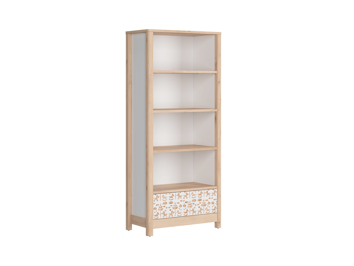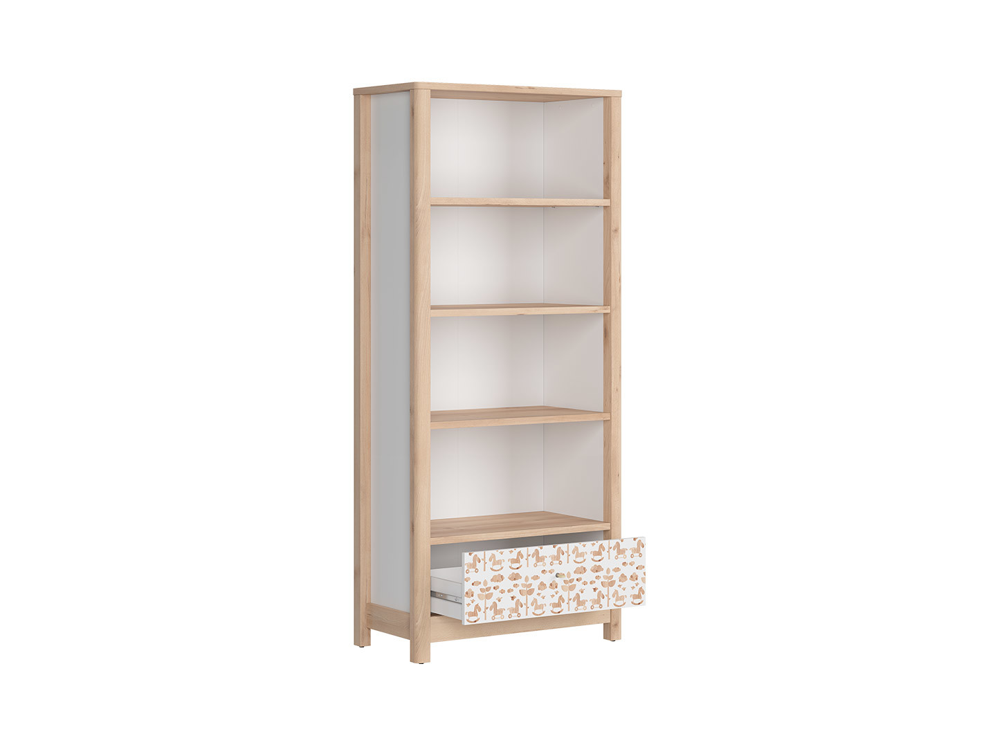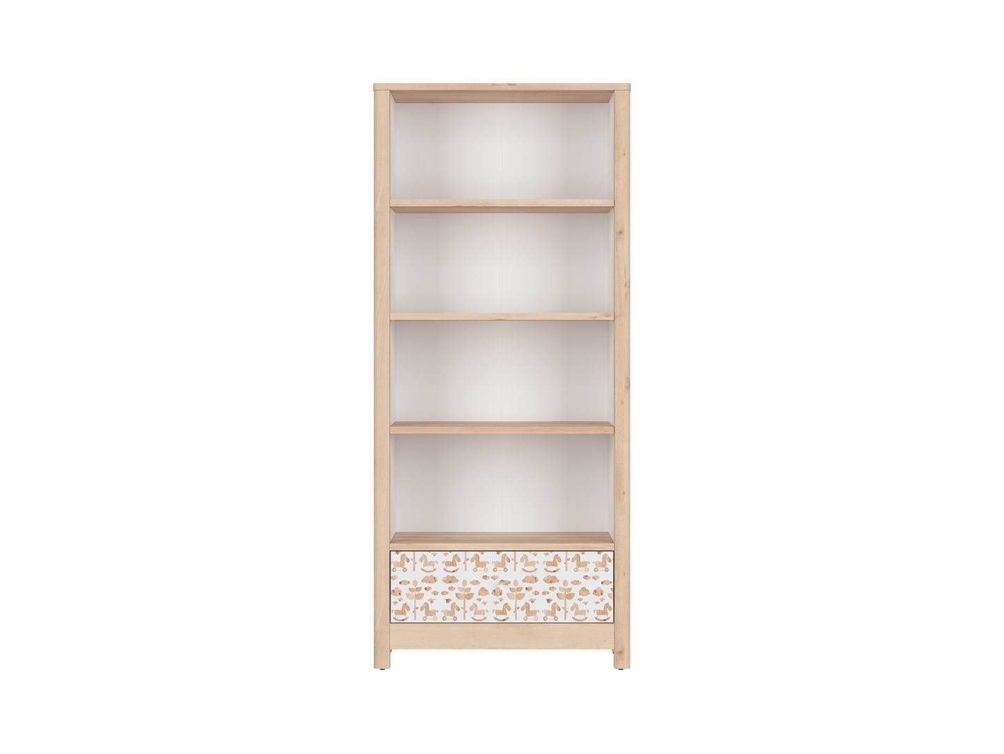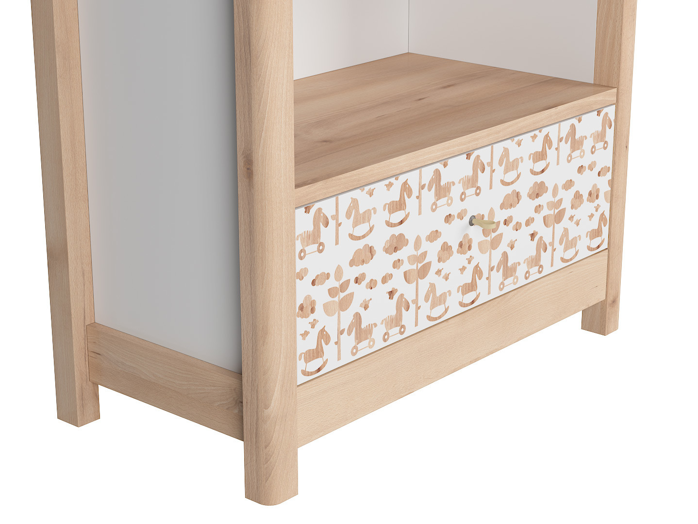 Praktický regál z kolekce Timon s roztomilým potiskem koní. Tento originální regál obsahuje 3 police a úložný prostor ve spodní části v podobě 1 zásuvky. Kožená úchytka představuje bezpečnou formu manipulace se zásuvkou. Kolekce Timon díky prvkům příjemné kombinace teplého dřeva a bílé barvy nabízí pohodlnou atmosféru pro nejmenší členy rodiny.