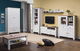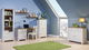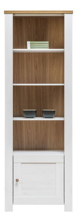 Krásný vysoký regál s třemi otevřenými poličkami umístěnými nad sebou a jednou skříňkou umístěnou na spodku regálu. Zajímavé drobné kulaté úchyty na dvířkách v provedení dub příjemně osvěží světlé provedení.