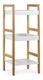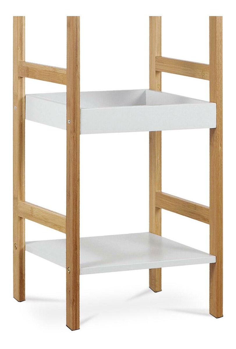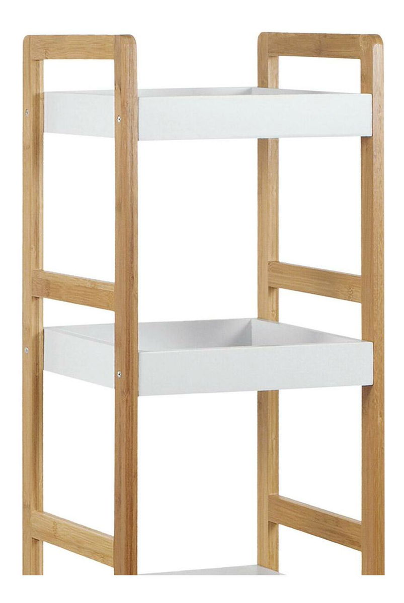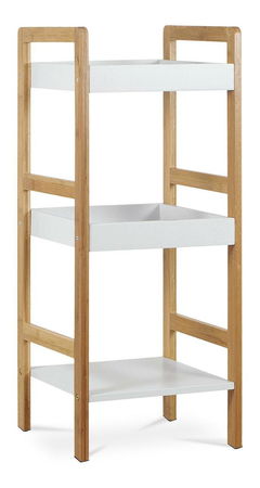 Multifunkční třípolicový regál ve Skandinávském stylu. Nosná konstrukce je vyrobena z masivního bambusu, lakovaného kvalitním transparentním lakem. Bambus jako takový opuzuje vodu a touto povrchovou úpravou dosahuje velmi dobré voděodolnosti. Police jsou vyrobeny z MDF desek a lakovány kvalitním polyuretanovým bílým matným lakem. Čím iu nich je zaručena voděodolnost. Tímto zpracováním je regál vhodný do koupelen, ale ideální bude i v ostatních místech domácnosti. Horní dvě police mají boky ze všech stran, třetí je klasická rovná. Jejich nosnost je až 3 kg, celková 9 kg. Ať už regál využijete pro uložení kosmetiky, ručníků a osušek nebo jako stojan na květiny či dekorace, vždy s ním budete spokojeni. Záleží jen na vašich nápadech.
