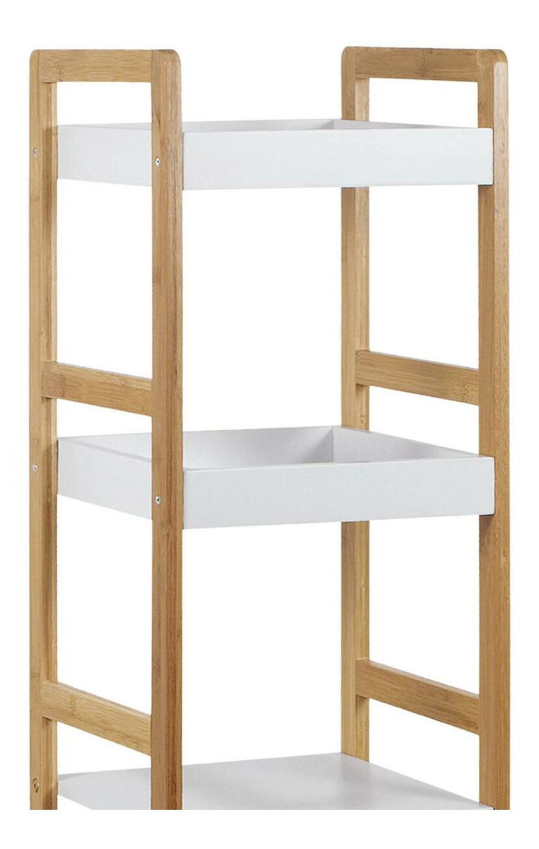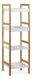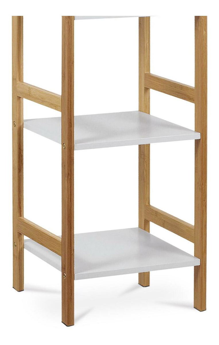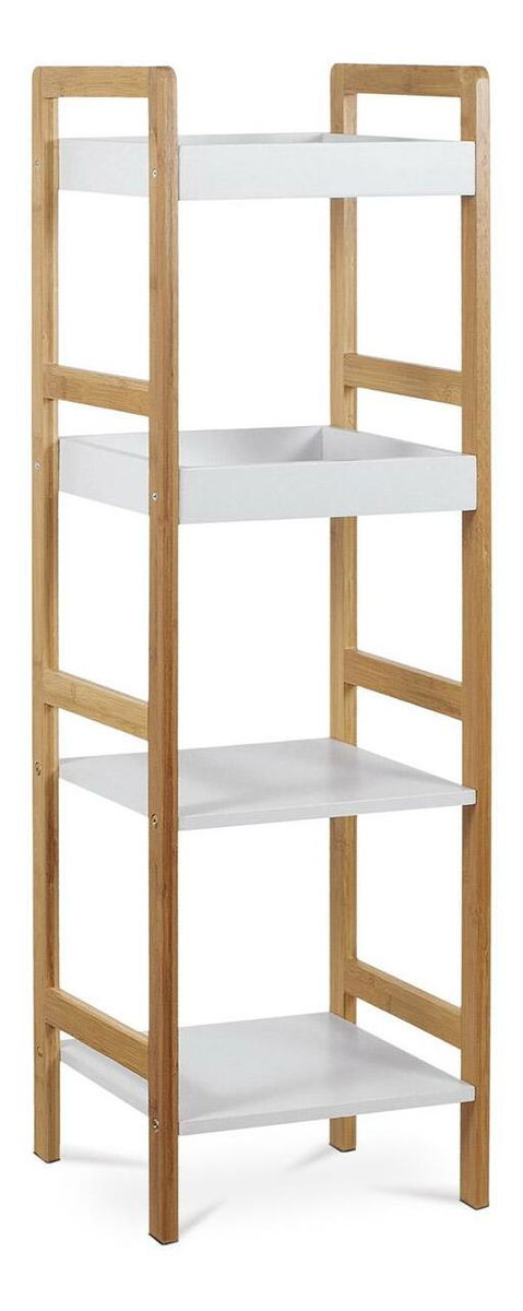 Multifunkční čtyřpolicový regál ve Skandinávském stylu. Nosná konstrukce je vyrobena z masivního bambusu, lakovaného kvalitním transparentním lakem. Bambus jako takový opuzuje vodu a touto povrchovou úpravou dosahuje velmi dobré voděodolnosti. Police jsou vyrobeny z MDF desek a lakovány kvalitním polyuretanovým bílým matným lakem. Čím iu nich je zaručena voděodolnost. Tímto zpracováním je regál vhodný do koupelen, ale ideální bude i v ostatních místech domácnosti. Horní dvě police mají boky ze všech stran, zbylé dvě jsou klasické rovné. Jejich nosnost je až 3 kg, celková 12 kg. Ať už regál využijete pro uložení kosmetiky, ručníků a osušek nebo jako stojan na květiny či dekorace, vždy s ním budete spokojeni. Záleží jen na vašich nápadech.