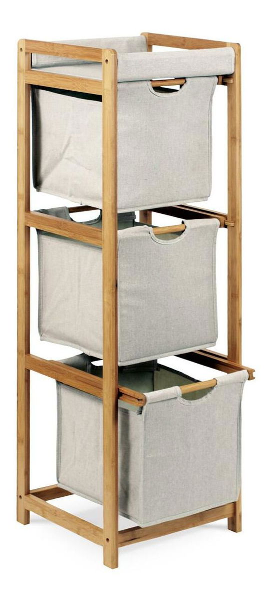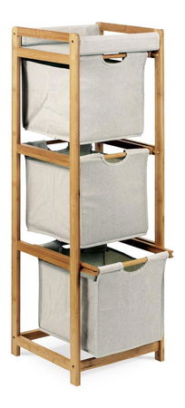 Multifunkční regál se třemi zásuvkami/boxy. Nosná konstrukce je vyrobena z masivního bambusu, lakovaného kvalitním transparentním lakem. Bambus jako takový opuzuje vodu a touto povrchovou úpravou dosahuje velmi dobré voděodolnosti. Výsuvné boxy jsou vyrobeny ze středně silné látky v šedém odstínu se závěsným rámem z bambusu. Regál vhodný do koupelen, ale také do síní či místností, kde upotřebíte úložné prostory. Látkové boxy jsou prodyšné, jejich nosnost je až 3 kg, celková 9 kg. Ideální regál k plné spokojenosti využijete pro uložení ručníků, osušek nebo i části oblečení, popř.